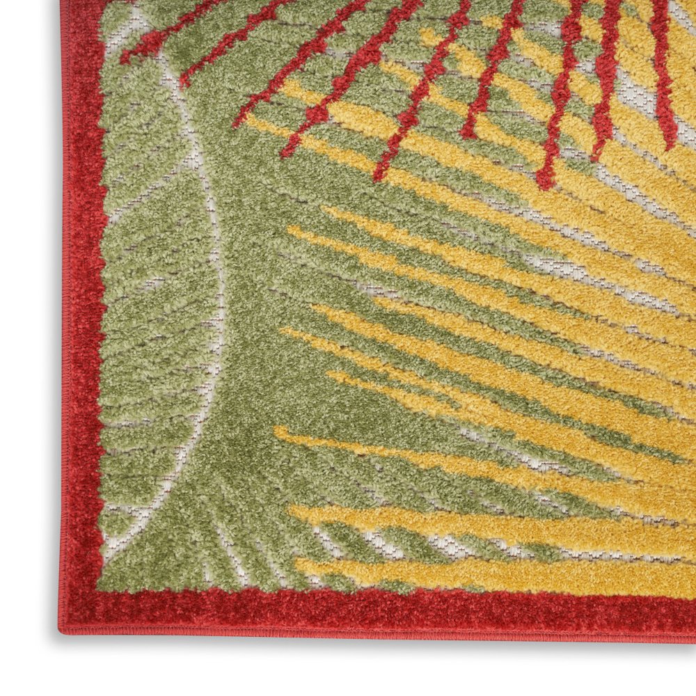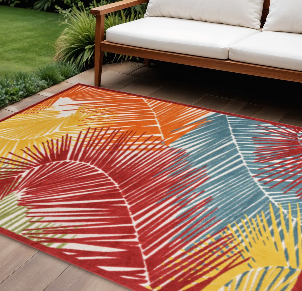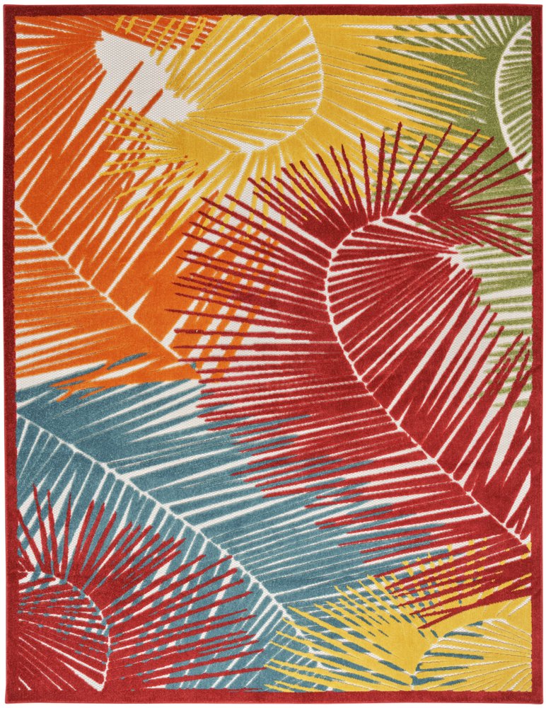Set an inviting tone in your space with this 10-foot x 13-foot yellow red orange blue and green palm leaf indoor outdoor area rug. This rectangle shaped rug features a palm leaf design that will work well both indoors or out. A classic shape marries with good looking design for your living room, hall, bedroom, porch, patio, or poolside. Ideal for outdoor spaces or high traffic areas with kids and pets, this rug is made from heavy duty polypropylene that is stain resistant to help repel water, dirt, and stains. Versatile in use, durable, and easy to maintain, this rug is an ideal solution to add a decorative and inviting touch to your indoor or outdoor space. 114-inch h x 156-inch w x 0.25-inch d.