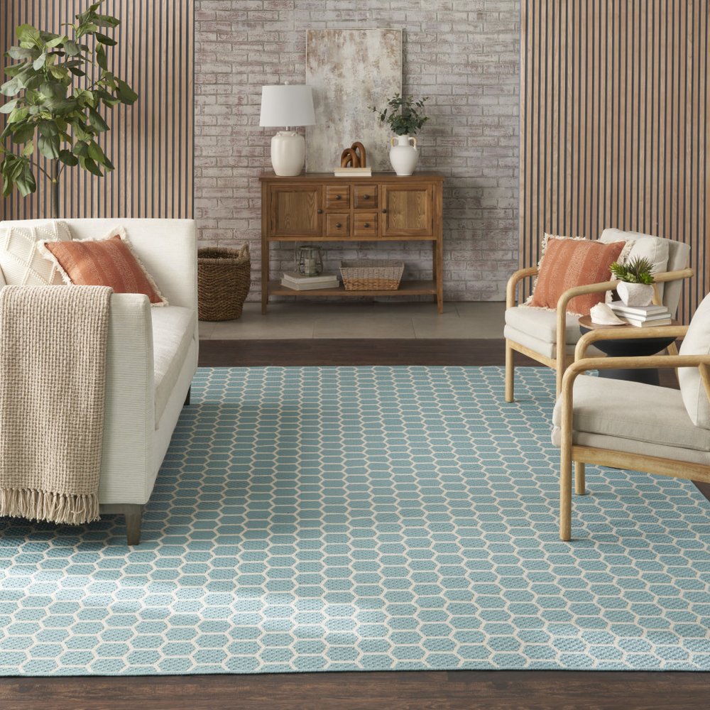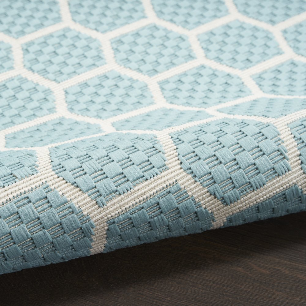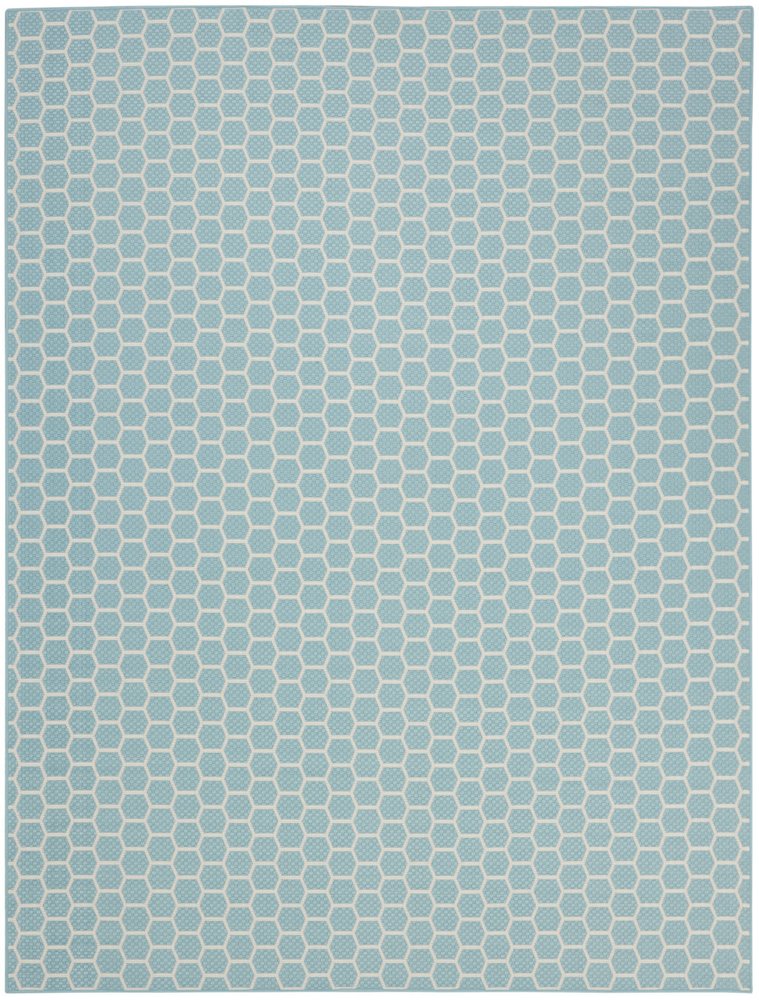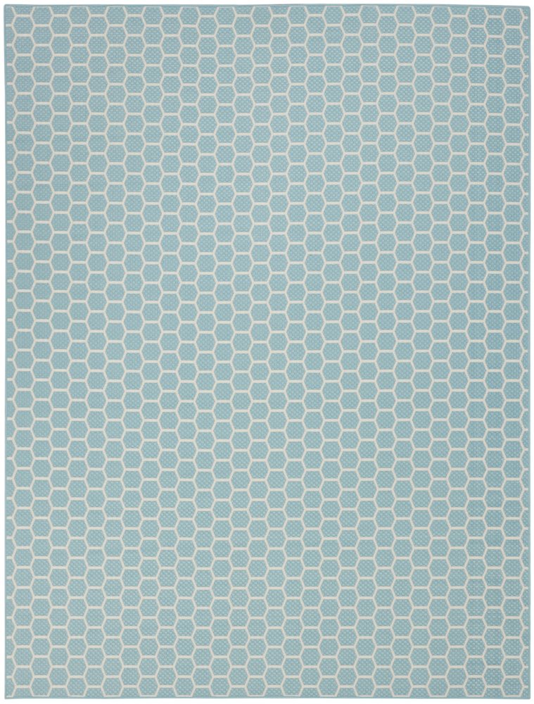This 10-foot x 14-foot aqua and ivory geometric indoor outdoor area rug, is a great way to add warmth to a room. This rectangle shaped rug features a geometric design that will work well both indoors or out. A classic shape marries with good looking design for your living room, hall, bedroom, porch, patio, or poolside. Makes a great way to dress up your patio, porch, or poolside, but also works well as a durable and easy to maintain option in the kitchen, family room, or mudroom. 120-inch h x 168-inch w x 0.23-inch d.