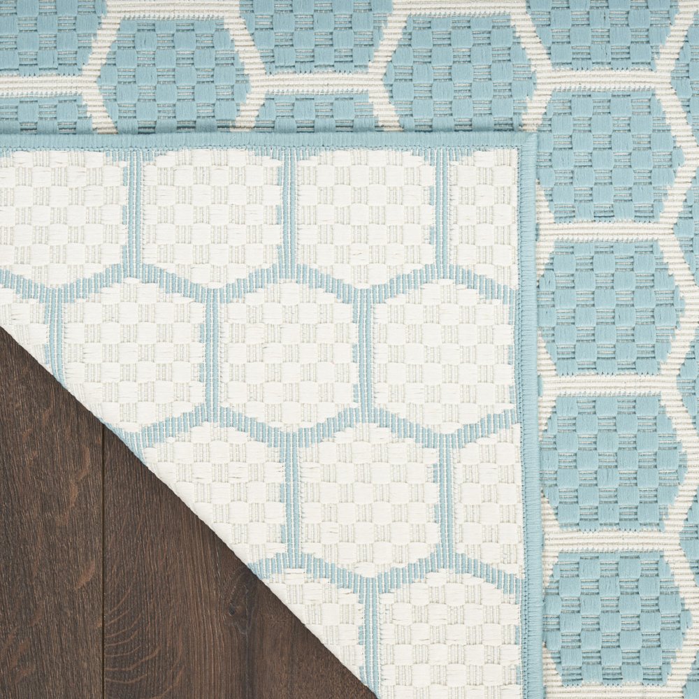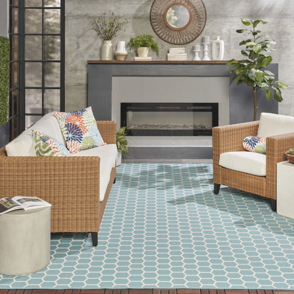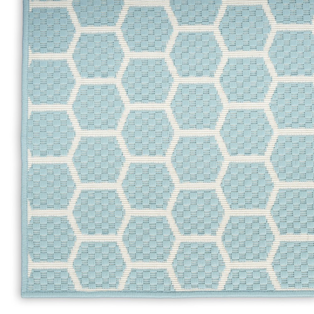 This 10-foot x 14-foot aqua and ivory geometric indoor outdoor area rug, is a great way to add warmth to a room. This rectangle shaped rug features a geometric design that will work well both indoors or out. A classic shape marries with good looking design for your living room, hall, bedroom, porch, patio, or poolside. Makes a great way to dress up your patio, porch, or poolside, but also works well as a durable and easy to maintain option in the kitchen, family room, or mudroom. 120-inch h x 168-inch w x 0.23-inch d.