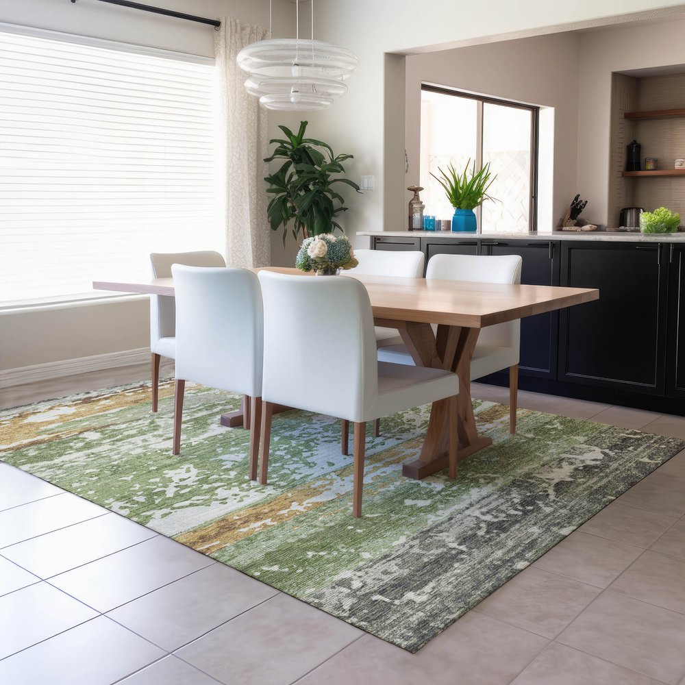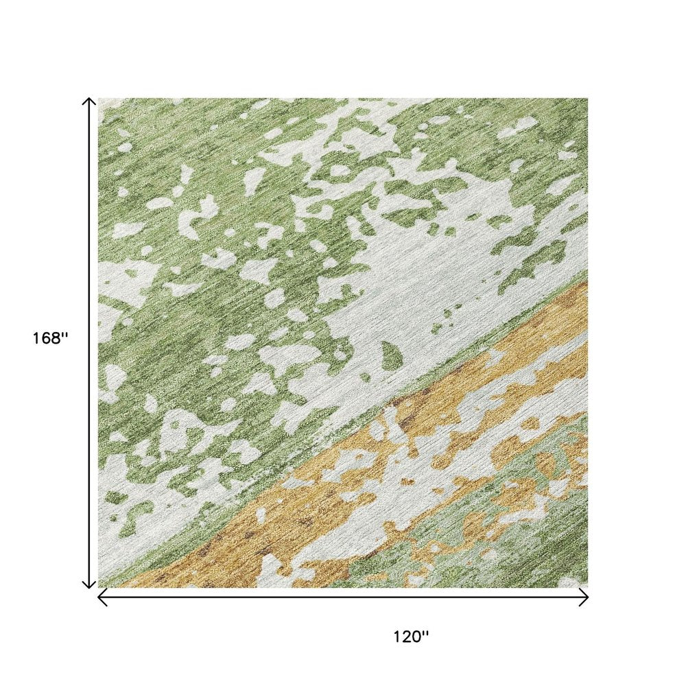 This 10-foot x 14-foot artichoke green gold and pewter striped washable indoor outdoor area rug, is a great way to add warmth to a room. This rectangle shaped rug features a striped design that will work well both indoors or out. A classic shape marries with good looking design for your living room, hall, bedroom, porch, patio, or poolside. Ideal for outdoor spaces or high traffic areas with kids and pets, this rug is made from heavy duty polyester that is stain resistant to help repel water, dirt, and stains. Makes a great way to dress up your patio, porch, or poolside, but also works well as a durable and easy to maintain option in the kitchen, family room, or mudroom. 120.00-inch h x 168.00-inch w x 0.19-inch d.