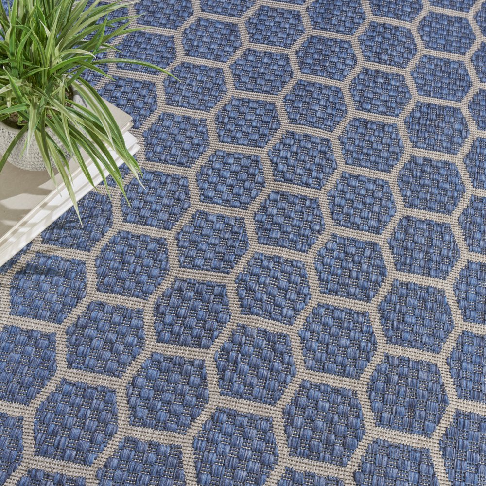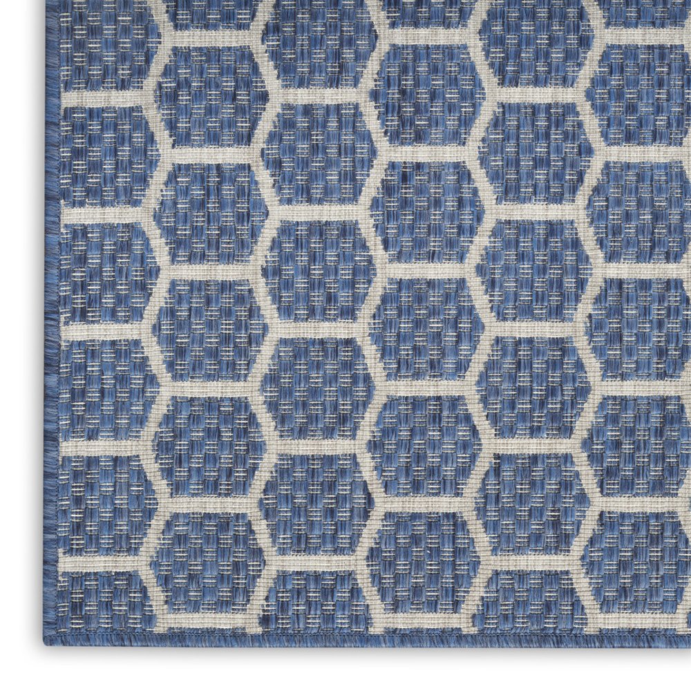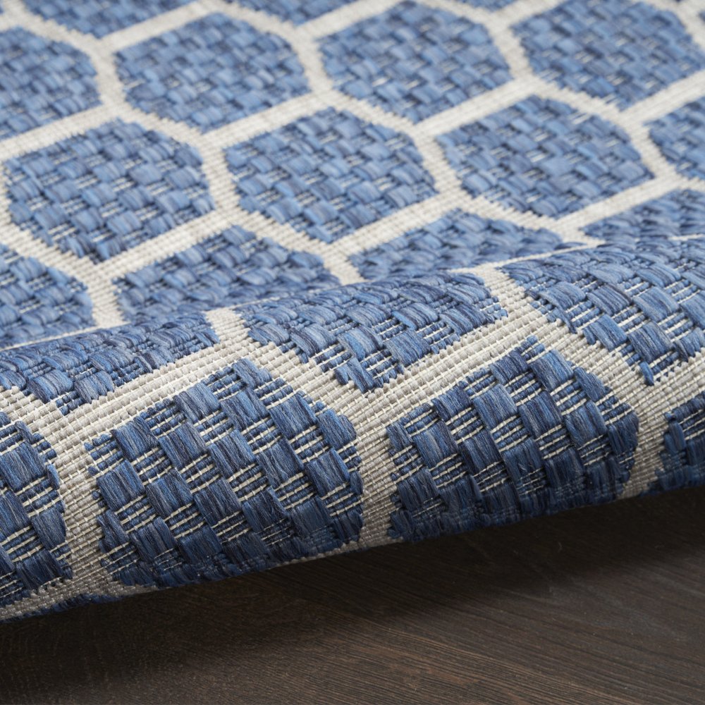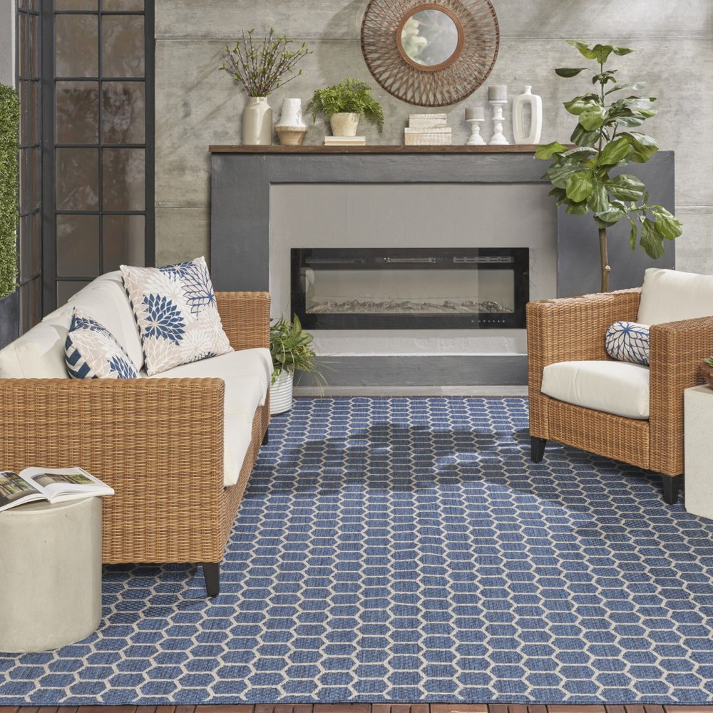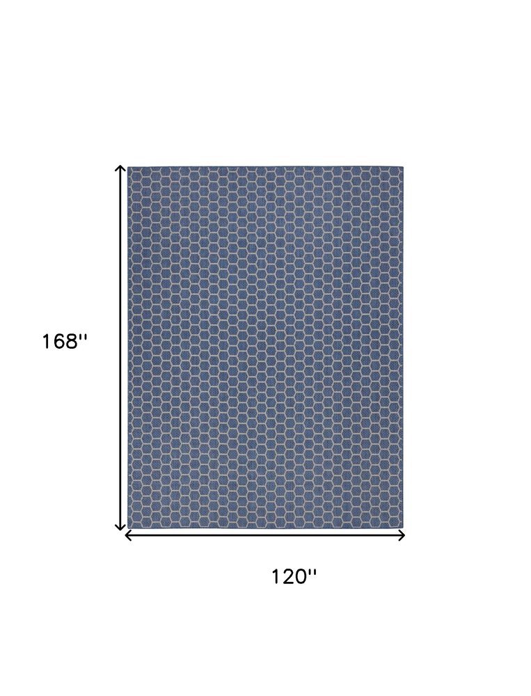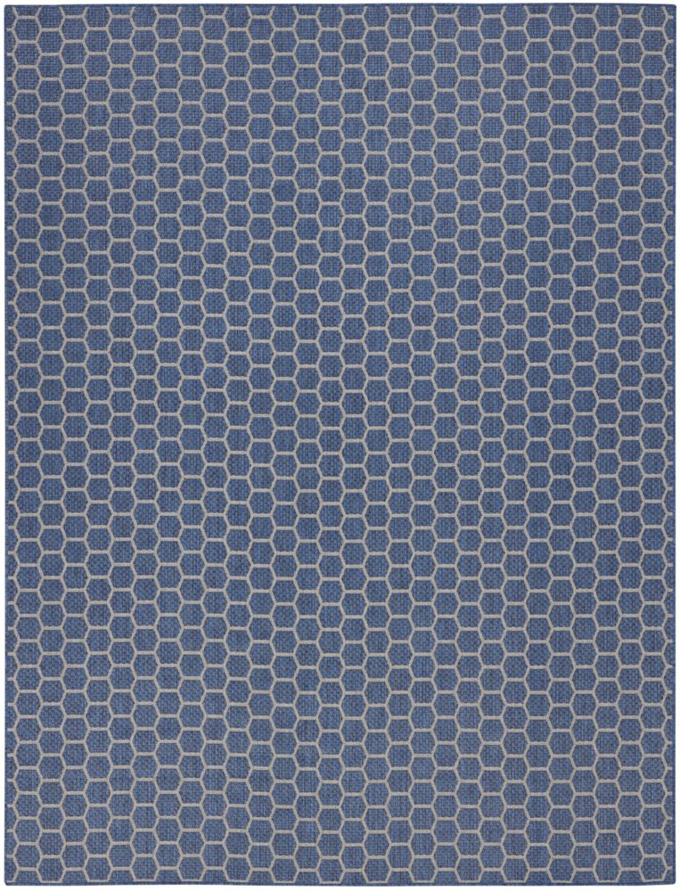 Add great coloration and comfortable texture to your space with this 10-foot x 14-foot blue and beige geometric indoor outdoor area rug. This rectangle shaped rug features a geometric design that will work well both indoors or out. A classic shape marries with good looking design for your living room, hall, bedroom, porch, patio, or poolside. Makes a great way to dress up your patio, porch, or poolside, but also works well as a durable and easy to maintain option in the kitchen, family room, or mudroom. 120-inch h x 168-inch w x 0.23-inch d.