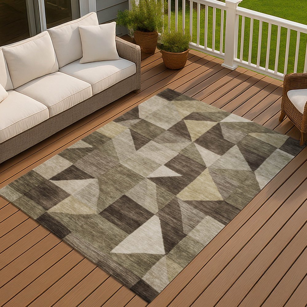 Add some artistry to your room with this 10-foot x 14-foot brown and beige geometric washable indoor outdoor area rug. This rectangle shaped rug features a geometric design that will work well both indoors or out. A classic shape marries with good looking design for your living room, hall, bedroom, porch, patio, or poolside. Ideal for outdoor spaces or high traffic areas with kids and pets, this rug is made from heavy duty polyester that is stain resistant to help repel water, dirt, and stains. Makes a great way to dress up your patio, porch, or poolside, but also works well as a durable and easy to maintain option in the kitchen, family room, or mudroom. 120.00-inch h x 168.00-inch w x 0.19-inch d.