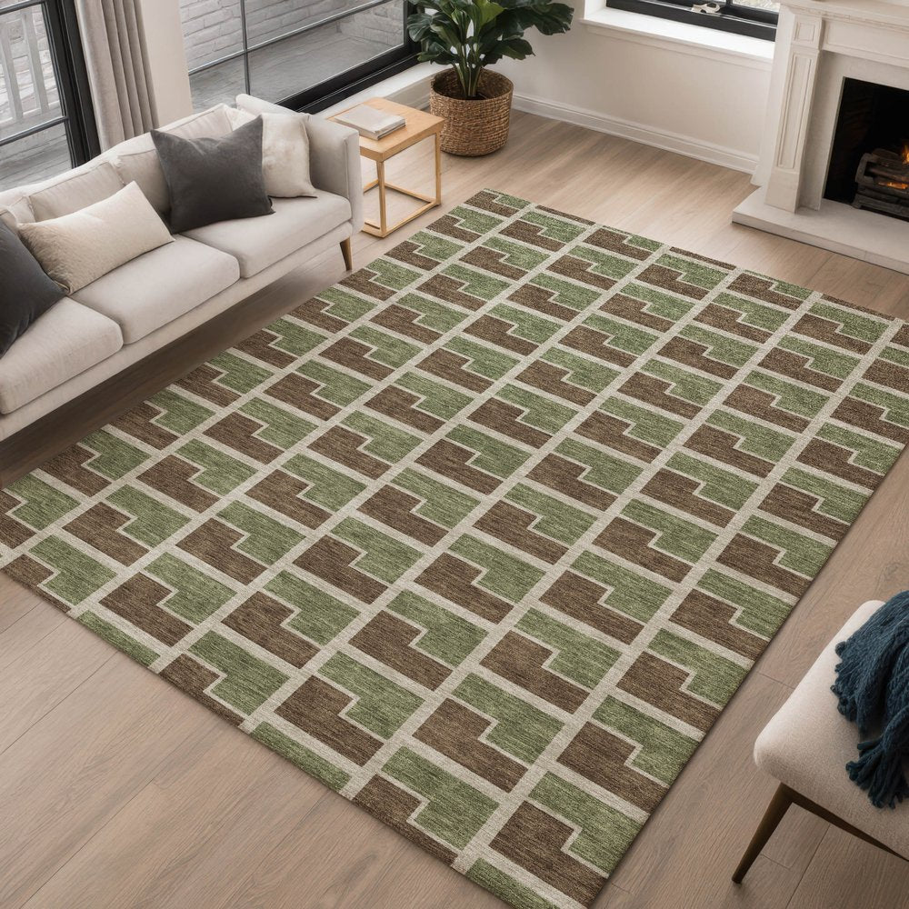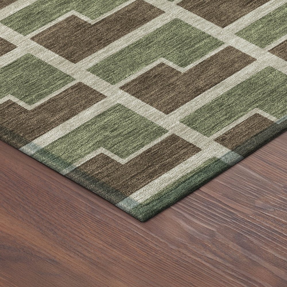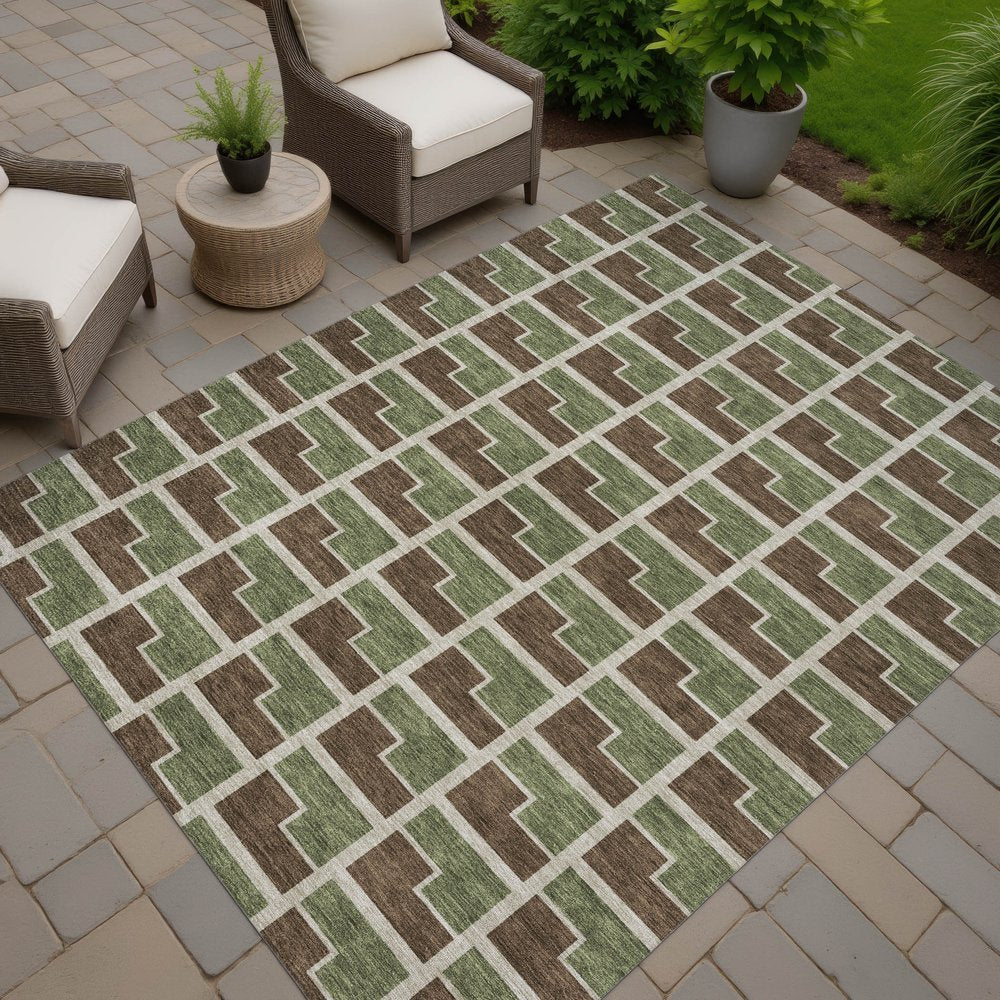 Set an inviting tone in your space with this 10-foot x 14-foot chocolate olive green and beige geometric washable indoor outdoor area rug. This rectangle shaped rug features a geometric design that will work well both indoors or out. A classic shape marries with good looking design for your living room, hall, bedroom, porch, patio, or poolside. Ideal for outdoor spaces or high traffic areas with kids and pets, this rug is made from heavy duty polyester that is stain resistant to help repel water, dirt, and stains. Versatile in use, durable, and easy to maintain, this rug is an ideal solution to add a decorative and inviting touch to your indoor or outdoor space. 120.00-inch h x 168.00-inch w x 0.19-inch d.