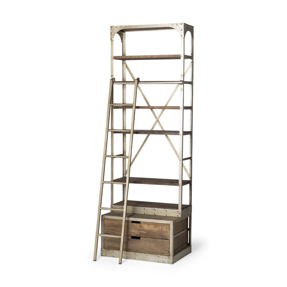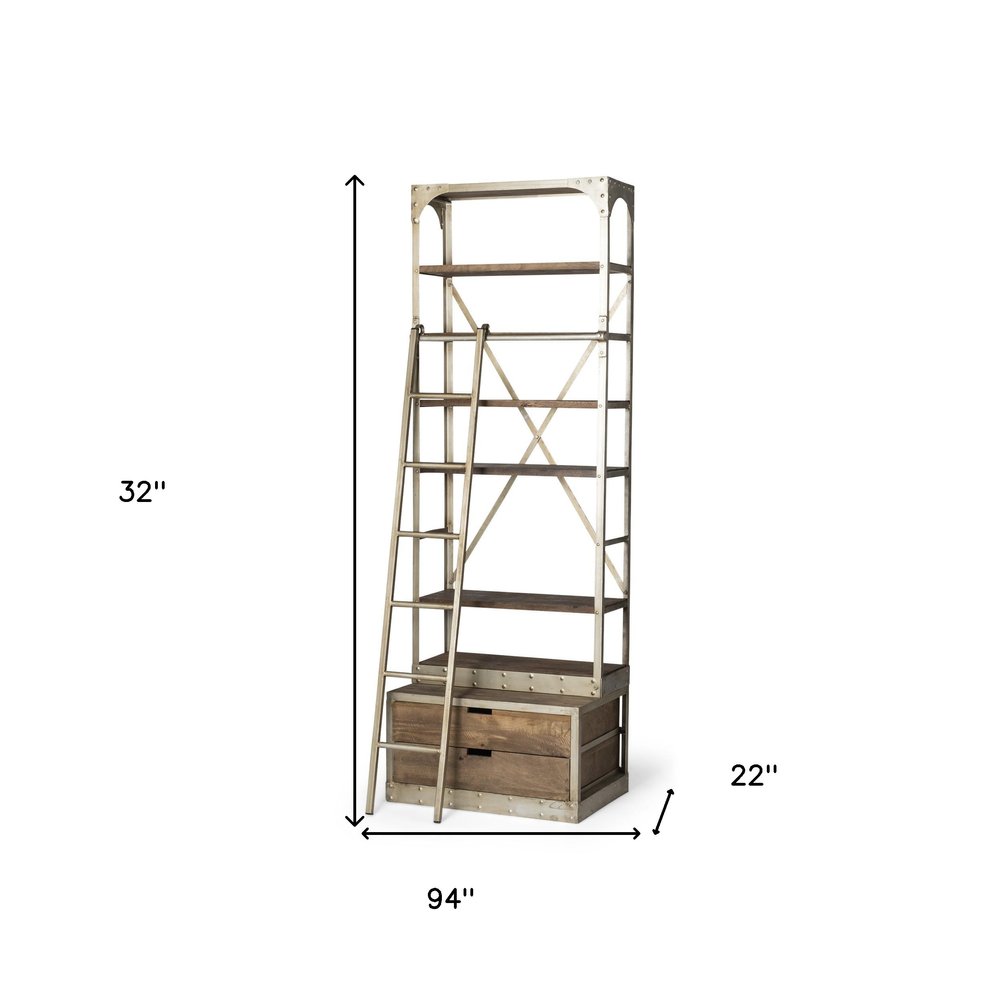 32" Light Brown And Nickel Metal and Solid Wood Six Tier Library Bookcase with Two Drawers