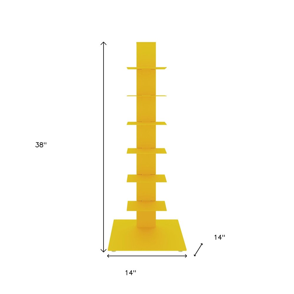Add a pop of color and modern design to your space with this versatile 38-inch yellow metal six shelf tower. This 38"H vertical tower shelving unit is made of steel for the ultimate in durability. There is a square steel plate at the base out of which there is a slab of steel that comes up and holds the shelves. There are six small shelves that allow you to display books, decor pieces, frames, or even small plants on them easily. 38.00-inch h x 14.00-inch w x 14.00-inch d.