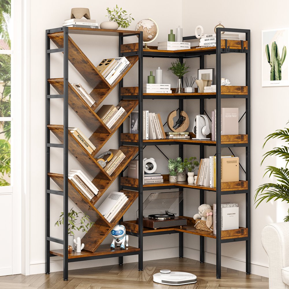 Sturdy and built to last, this 69-inch brown and black wood and metal ten tier corner bookcase helps you display your books, files, photos, and treasures in an organized fashion. Ready to be used in most any room, this versatile unit can be configured in the L-shape but can also be flat against the wall. The functional five tiers feature 10 shelf levels that offers a unique modern design with a large amount of storage and display space. Complete with a purposefully distressed finish, this chic brown and black shelving unit has an aged, vintage rustic feel. 69.30-inch h x 65.70-inch w x 9.45-inch d.