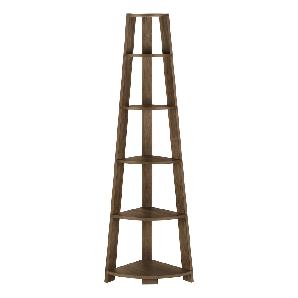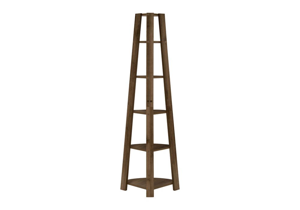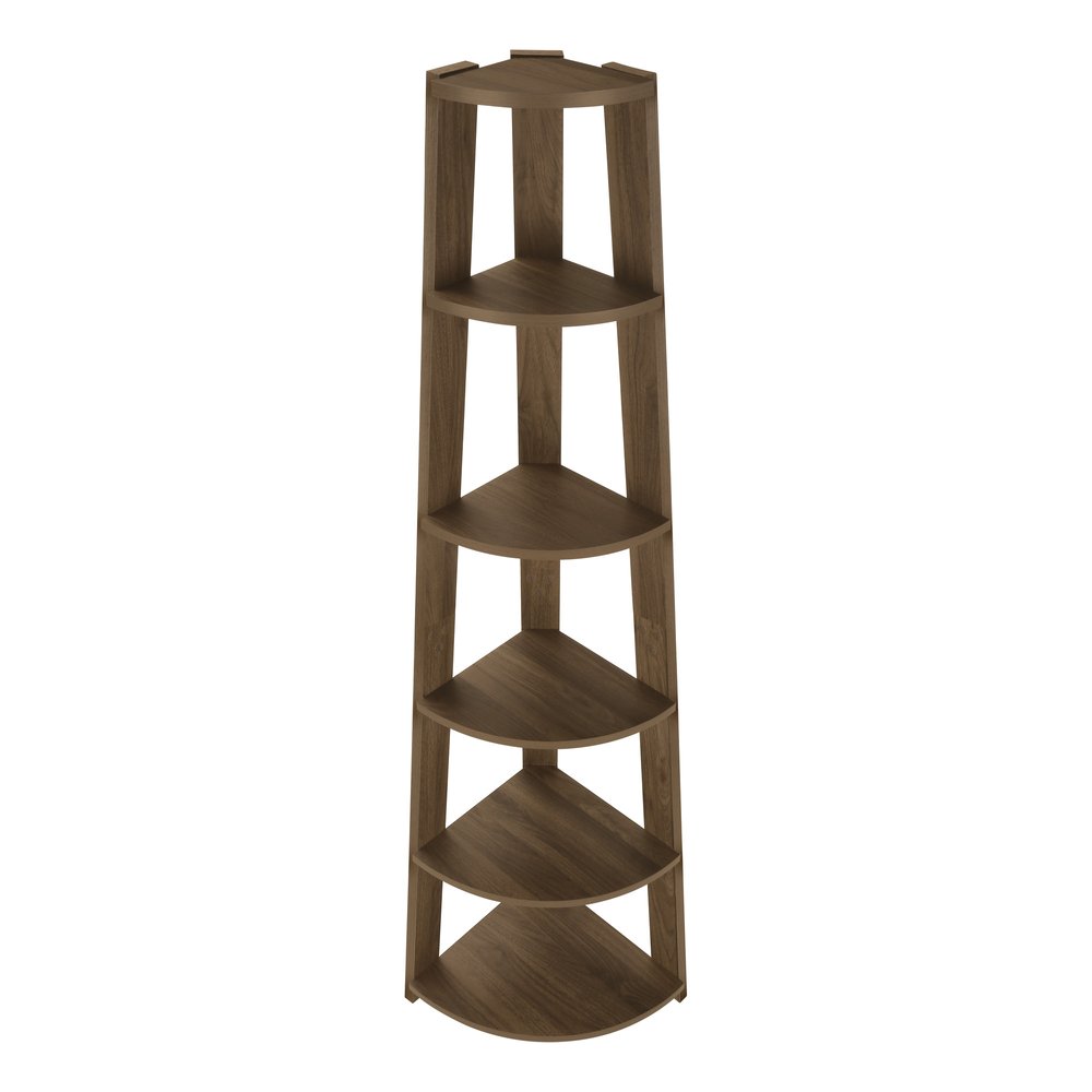 The 71-inch dark brown wood five tier corner bookcase offers you storage and display space in a good looking and refined manor. 5 shelf tiers are available, providing great storage and display options for everything from books and photos to decorations. Great to use independently or pair with additional units to create a different look and add even more storage. Carefully crafted to fit in tight spaces, you can turn almost any nook into a stunning display showcase for books, plants decor and more. 71.25-inch h x 22.50-inch w x 15.50-inch d.