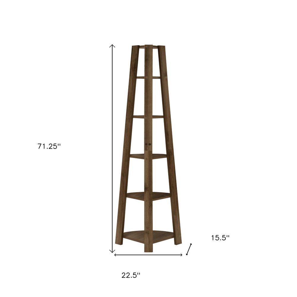 71" Dark Brown Wood Five Tier Corner Bookcase