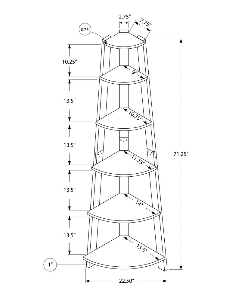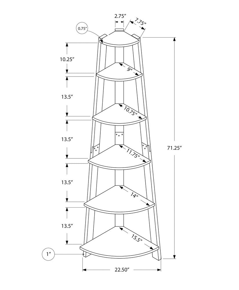 This gray wood five tier corner bookcase is a fresh and updated way to help you keep your space neat and organized. The functional 5 shelf tiers offer fantastic storage space. This bookcase is perfect for use alone or in multiples in most any living or office space. Increase your room's capacity for storage and display with this great shelving unit. 71.25-inch h x 15.5-inch w x 22.5-inch d.