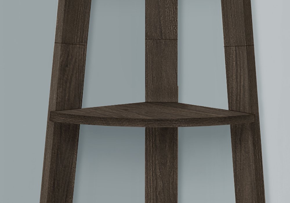 The 71-inch oak particle board and wood five tier corner bookcase offers you storage and display space in a good looking and refined manor. The functional 5 shelf tiers offer fantastic storage space. Great to use independently or pair with additional units to create a different look and add even more storage. Carefully crafted to fit in tight spaces, you can turn almost any nook into a stunning display showcase for books, plants decor and more. 71.25-inch h x 22.50-inch w x 15.50-inch d.