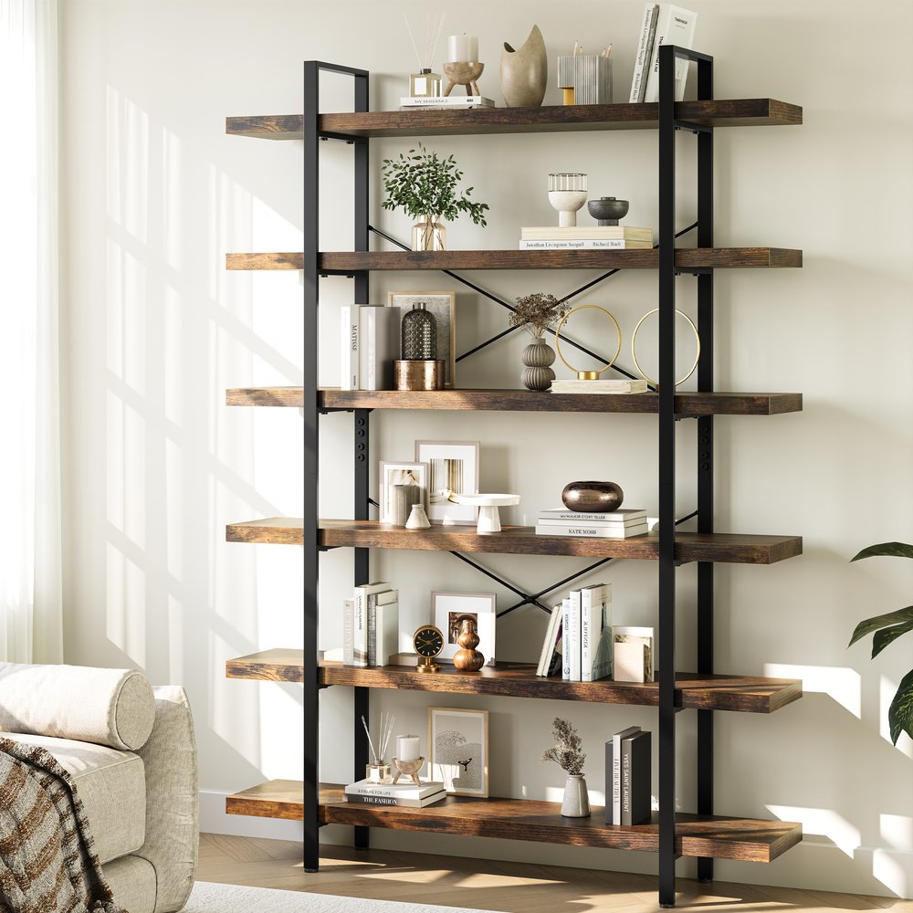 Sturdy and built to last, this 80-inch brown wood six tier etagere bookcase helps you display your books, files, photos, and treasures in an organized fashion. 6 shelf tiers are available, providing great storage and display options for everything from books and photos to decorations. Great to use independently or pair with additional units to create a different look and add even more storage. Carefully crafted to fit in tight spaces, you can turn almost any nook into a stunning display showcase for books, plants decor and more. 79.90-inch h x 47.20-inch w x 12.60-inch d.