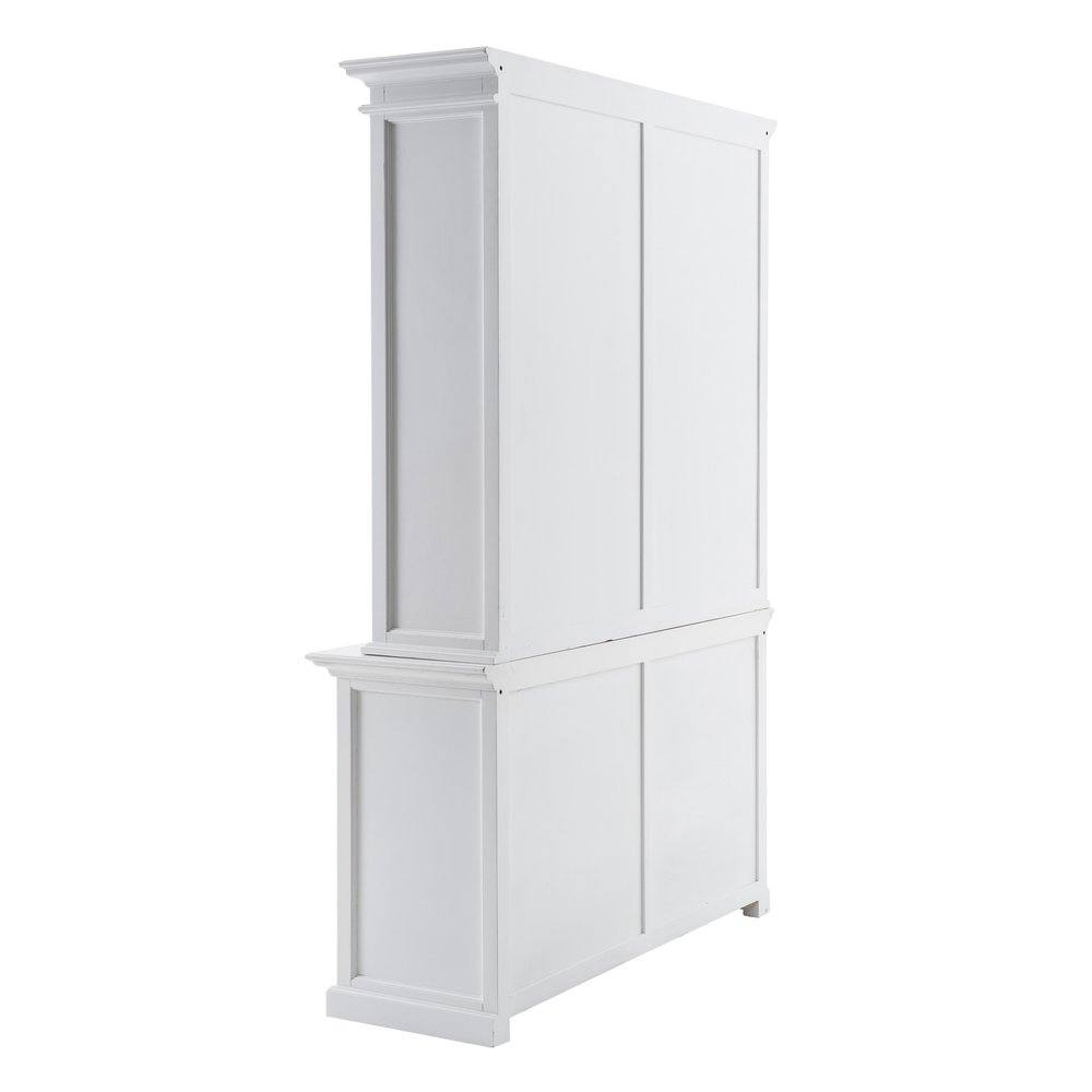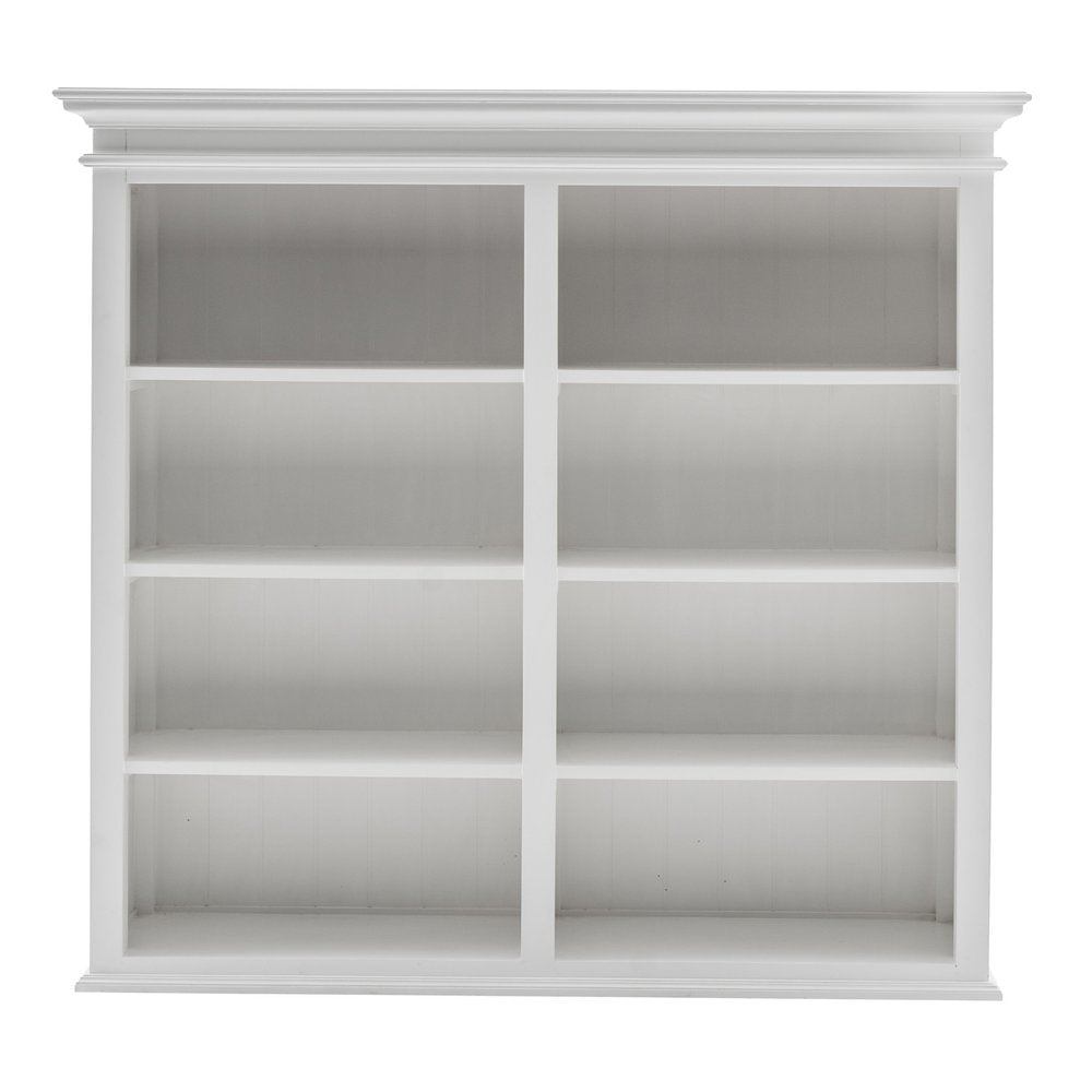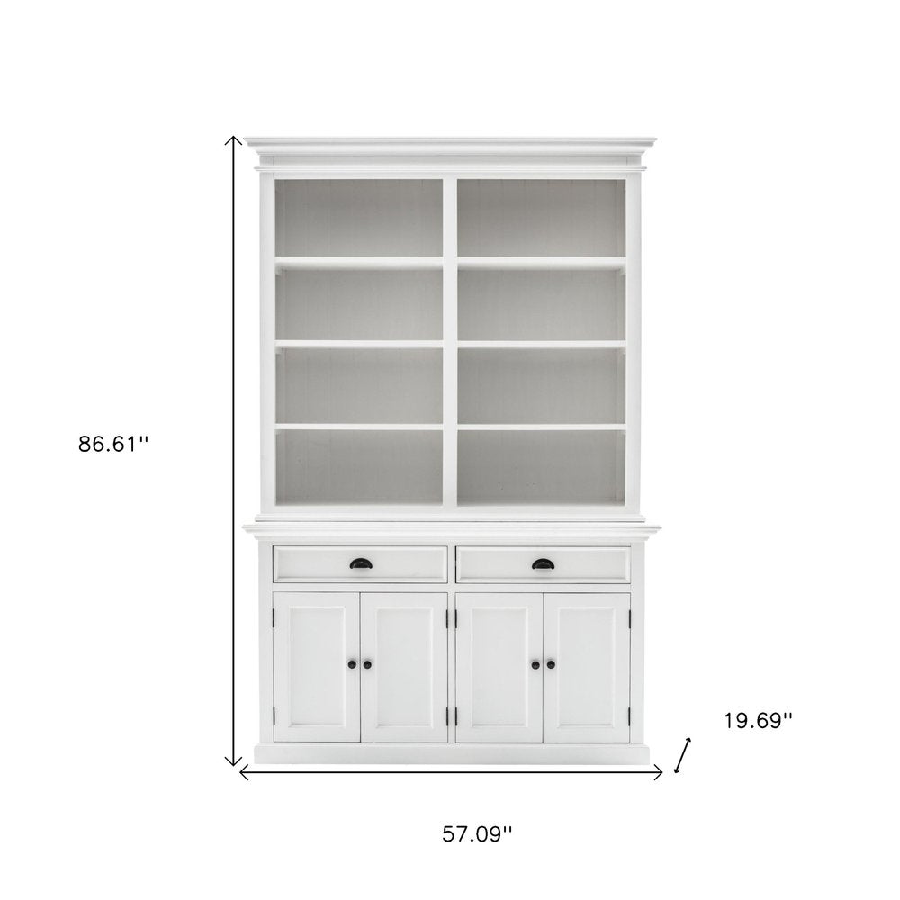 Sturdy and built to last, this 87-inch white solid wood adjustable four tier bookcase helps you display your books, files, photos, and treasures in an organized fashion. 4 shelf tiers are available, providing great storage and display options for everything from books and photos to decorations. Great to use independently or pair with additional units to create a different look and add even more storage. Increase your room's capacity for storage and display with this great shelving unit. 86.61-inch H x 57.09-inch W x 19.69-inch D