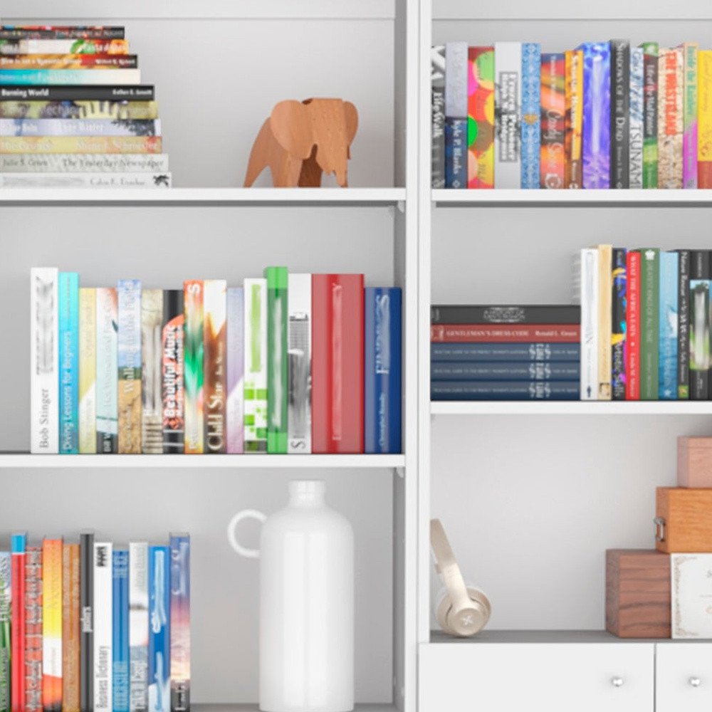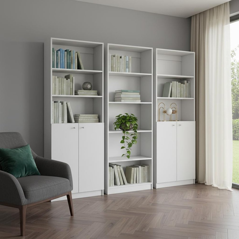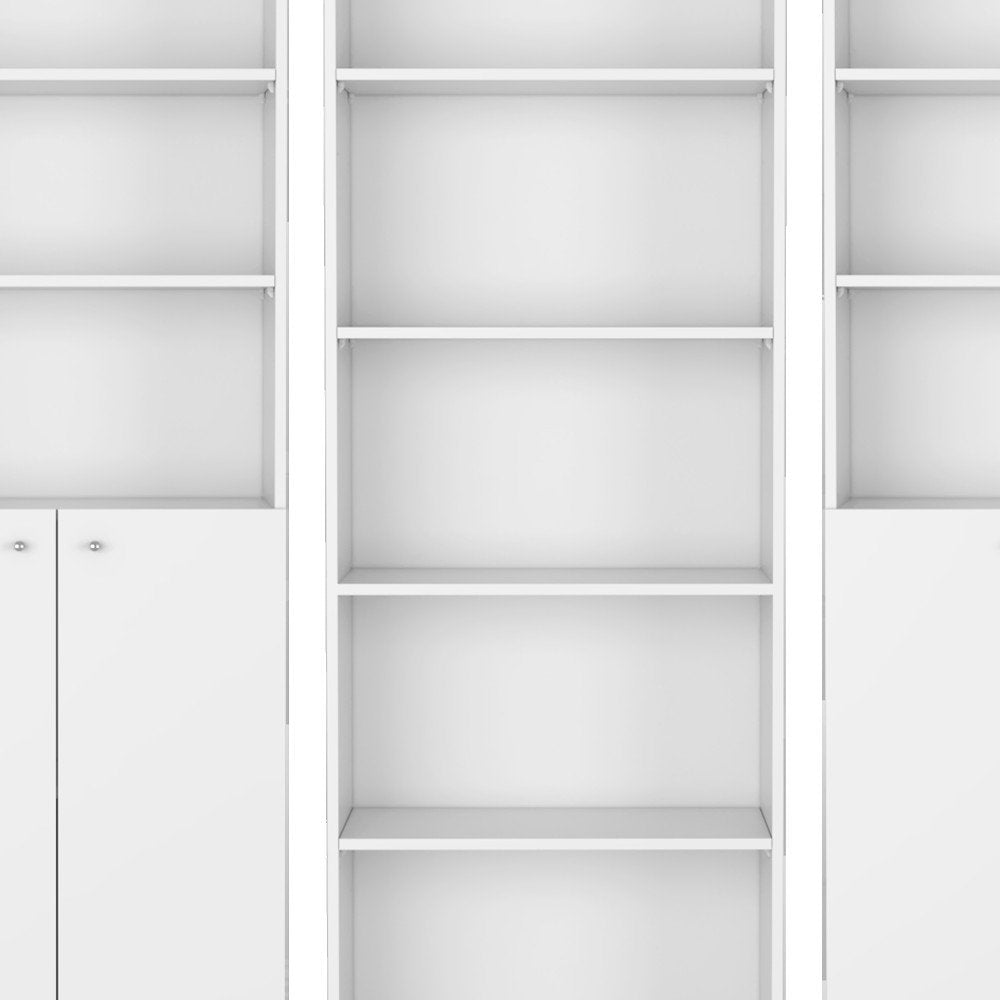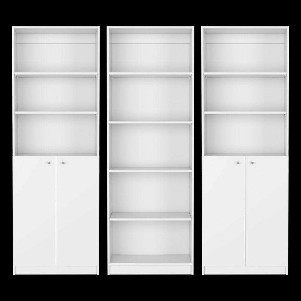 The set of three white wood five tier modular bookcase with four doors offers you storage and display space in a good looking and refined manor. The functional 5 shelf tiers offer fantastic storage space. Great to use independently or pair with additional units to create a different look and add even more storage. Increase your room's capacity for storage and display with this great shelving unit. 71.10-inch h x 24.70-inch w x 11.70-inch d.
