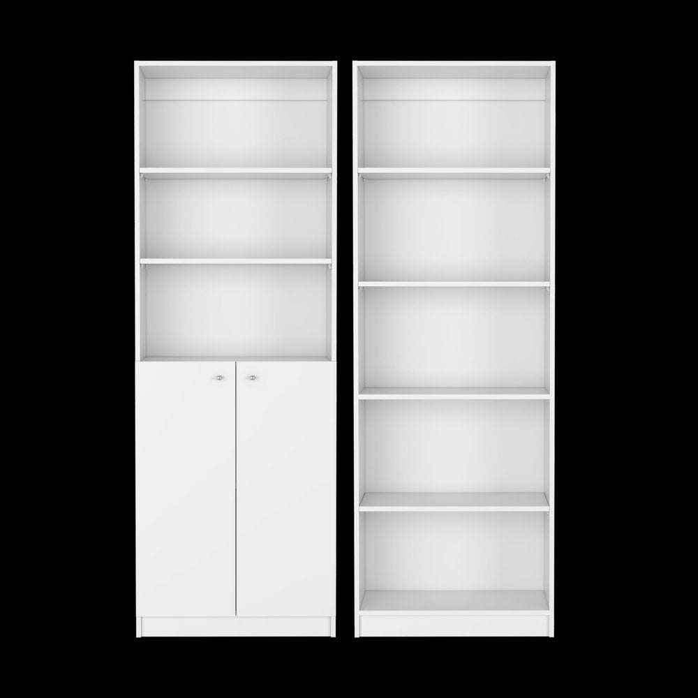 The set of two white wood five tier modular bookcase with two doors offers you storage and display space in a good looking and refined manor. Features 5 shelf tiers for storing books, displaying photographs, plants, or other decorations. Great to use independently or pair with additional units to create a different look and add even more storage. Increase your room's capacity for storage and display with this great shelving unit. 71.10-inch h x 24.70-inch w x 11.70-inch d.