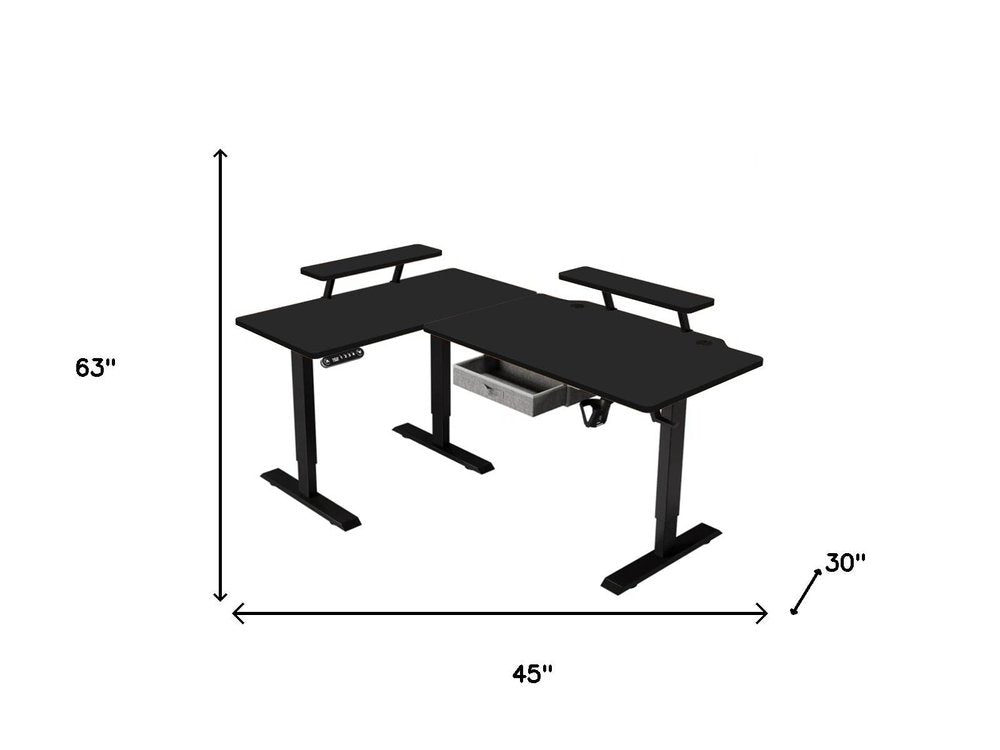This adjustable oak and beige wood and metal corner rolling t-shape standing desk gives you lots more options than a standard desk. This adjustable oak and beige wood and metal corner rolling t-shape standing desk is a great way to bring maximum amount of desk in a minimal amount of space to your living room, home office or bedroom. Built to last, this sturdy desk is designed for comfort and efficiency for years to come. 63.00-inch h x 45.00-inch w x 30.00-inch d.