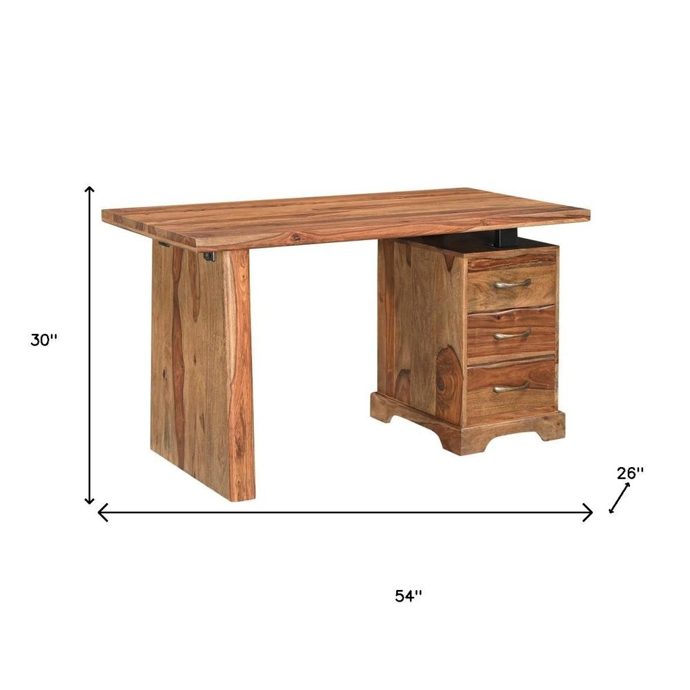 54" Brown Solid Wood Writing Desk and Bookshelf Set With Three Drawers