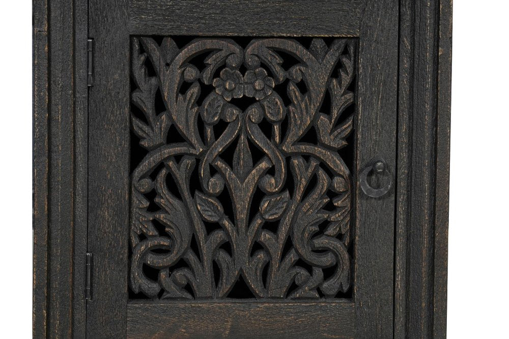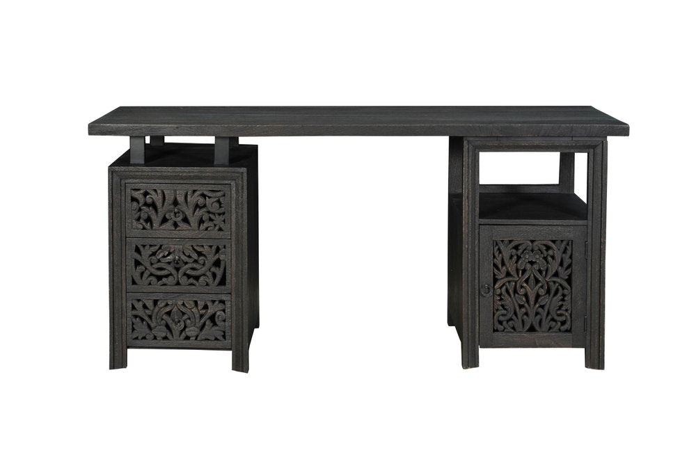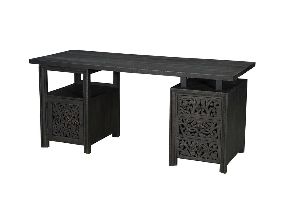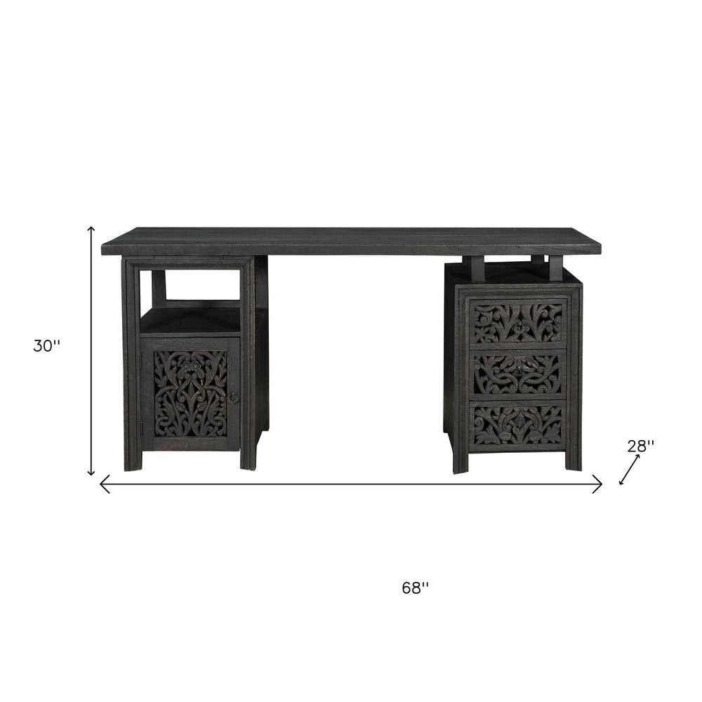 Look like an executive when you add this 68-inch black solid wood desk with three drawers to your office space. Designed to easily fit into most spaces, this classically shaped rectangular desk will turn your room into a productive workspace. A cabinet on one side and three drawers on the other, give this desk plenty of hidden storage for your office essentials. Built to last, this sturdy mango wood desk features a dark rustic finish and gorgeous carved floral detailing. 30.00-inch h x 68.00-inch w x 28.00-inch d.