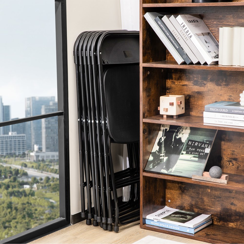 Add lots of seating and functionality to any space with this set of four black metal outdoor folding stacking dining chairs. Featuring a partially open back, foam seats, and an armless design, these versatile chairs fold when not in use. Great for entertaining or when you need extra seating, these indoor / outdoor chairs are light-weight, portable, and just what you need for your next gathering or event. 31.00-inch h x 18.10-inch w x 18.00-inch d.