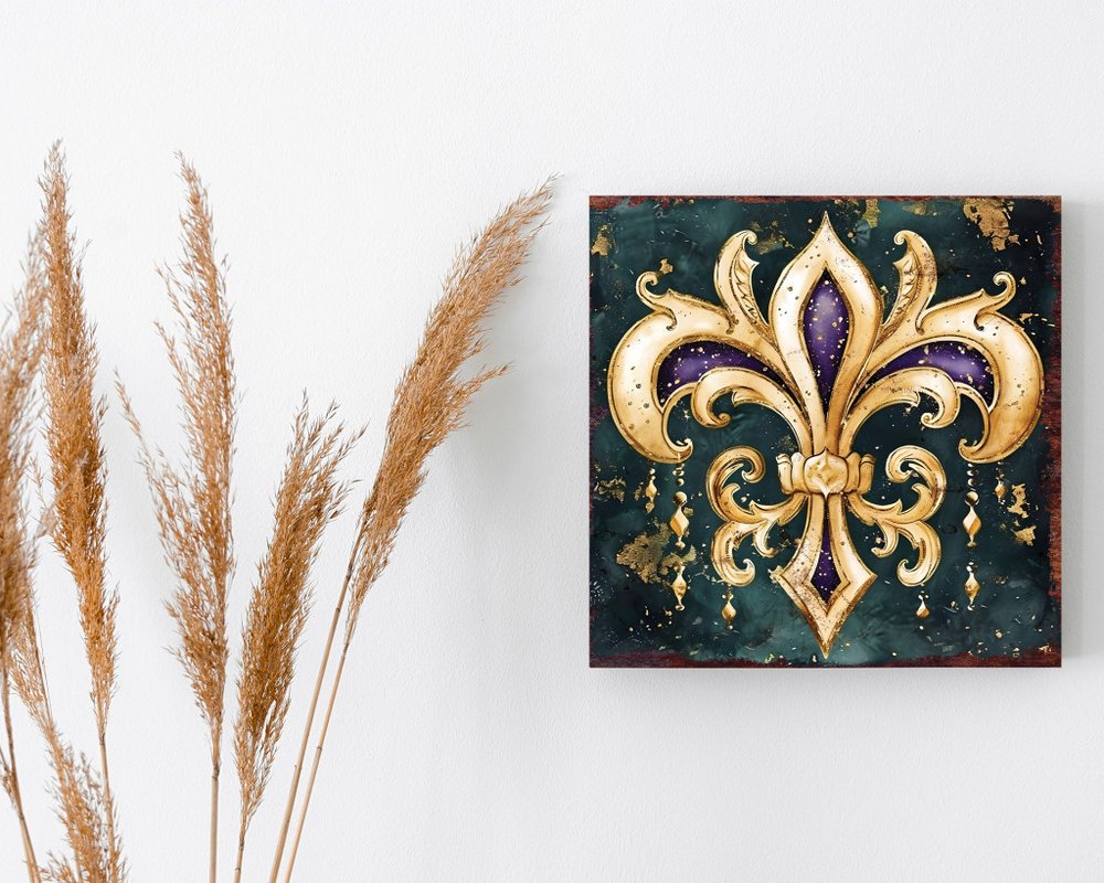 12" X 12" Black Gold And Purple Mardi Gras Canvas Square Hanging Wall Decor