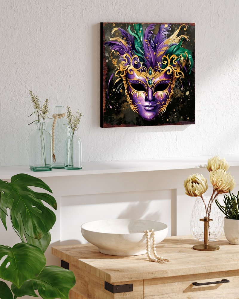 12" X 12" Black Gold And Purple Mardi Gras Canvas Square Hanging Wall Decor