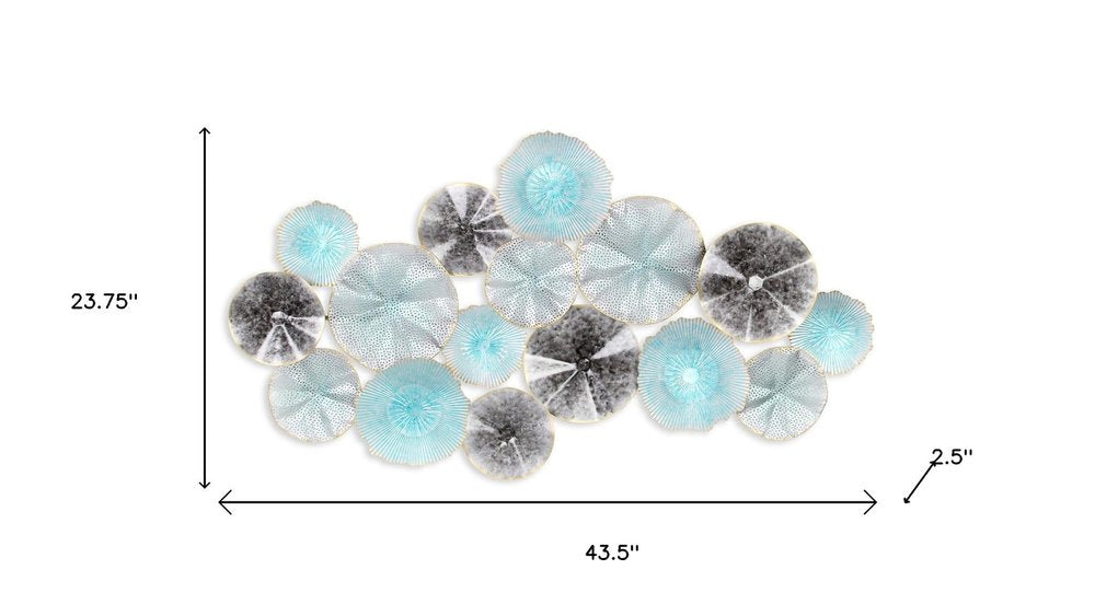 24" X 44" Aqua Charcoal And Silver Abstract Metal Round Discs Hanging Dimensional Sculpture