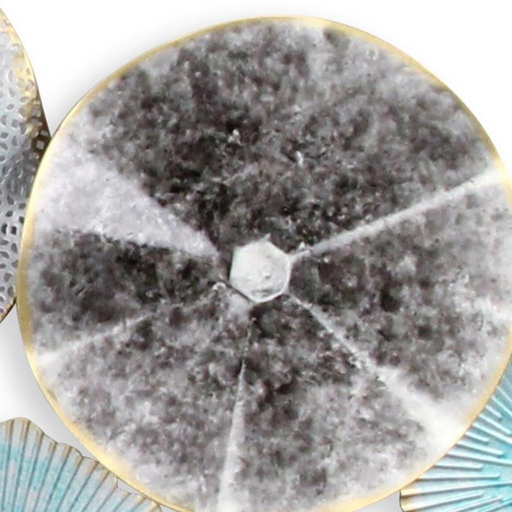 Handmade with care, this fabulous abstract metal round discs dimensional wall decor brings a touch of modern coastal chic style and authenticity to your space. Crafted from durable metal, this hanging dimensional sculpture showcases multi-shades of blue accented with charcoal, silver, and gold that enhances any room’s atmosphere. With materials and a finish that are purposefully distressed, this hanging wall decor will instantly liven things up and bring color and dimension to your walls. Elevate your home with this eye-catching centerpiece that exudes warmth and creativity. 23.75-inch h x 43.50-inch w x 2.50-inch d.