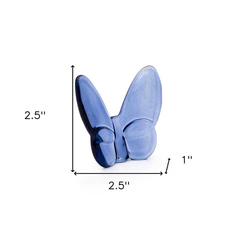 This 3-inch dark blue crystal butterfly figurine tabletop sculpture will add a beautiful decorative accent to your decor. This charming decorative accent is expertly made of high grade crystal in a dark blue coloration. Inspired by one of nature's most revered icons, this pretty butterfly inspired sculpture will be a beautiful and special addition to your room's decor. This pretty butterfly brings a touch of elegance and some outdoor beauty to your space. It's a perfect addition for those who love an up-to-the-minute look and feel. 2.5-inch h x 2.5-inch w x 1-inch d.