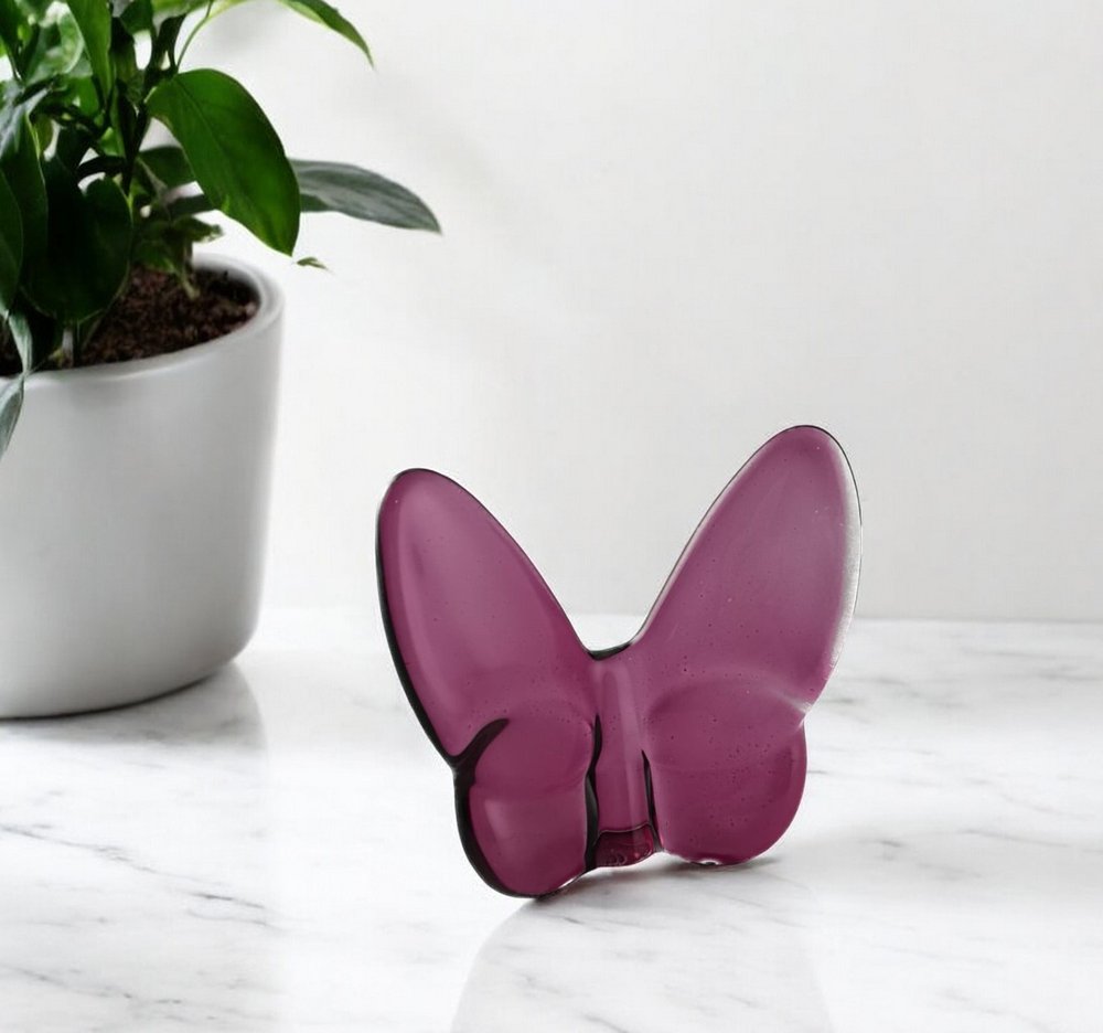 Add an air of fashion to your room and rejuvenate the space with this 3-inch plum crystal butterfly figurine tabletop sculpture. The plum coloring of this high quality crystal accent will look great in most any space. Inspired by one of nature's most revered icons, this pretty butterfly inspired sculpture will be a beautiful and special addition to your room's decor. This pretty butterfly brings a touch of elegance and some outdoor beauty to your space. Great to use on its own or mix with other decorations for the perfect look. 2.5-inch h x 2.5-inch w x 1-inch d.