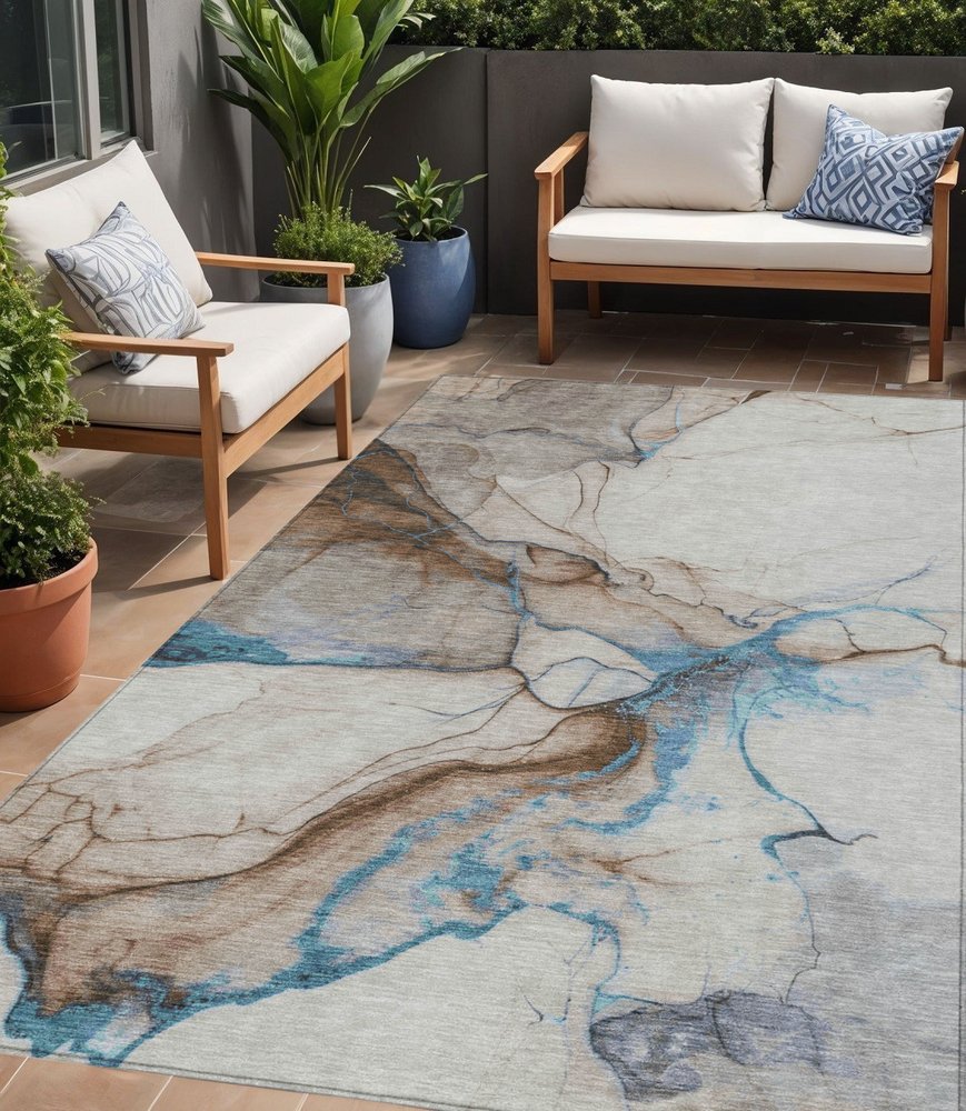 Add some artistry to your room with this 3-foot x 5-foot beige and blue abstract washable indoor outdoor area rug. This rectangle shaped rug features a abstract design that will work well both indoors or out. A classic shape marries with good looking design for your living room, hall, bedroom, porch, patio, or poolside. Ideal for outdoor spaces or high traffic areas with kids and pets, this rug is made from heavy duty polyester that is stain resistant to help repel water, dirt, and stains. Versatile in use, durable, and easy to maintain, this rug is an ideal solution to add a decorative and inviting touch to your indoor or outdoor space. 36-inch h x 60-inch w x 0.19-inch d.