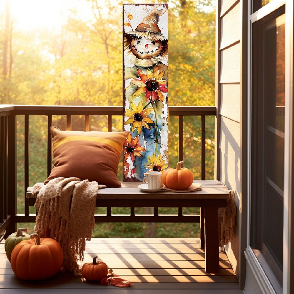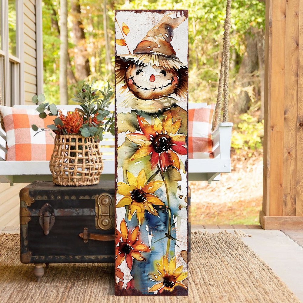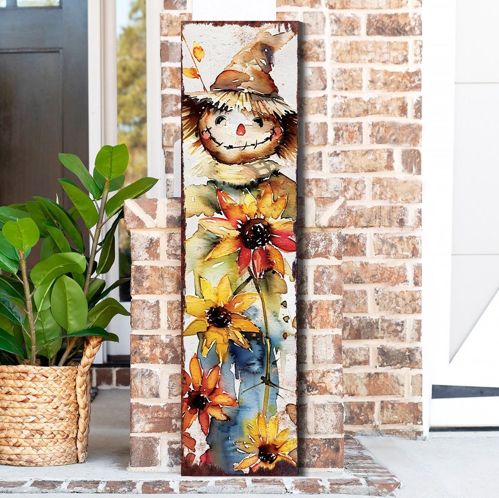 The 36-inch brown white and yellow scarecrow solid wood porch sign adds a charming touch to your outdoor space. Crafted from solid wood, this porch sign ensures durability and a classic appeal. Its traditional style seamlessly blends with various garden themes, enhancing the overall aesthetic of your space. The warm colors of brown, white, and yellow create a welcoming atmosphere, making it a perfect addition for festive occasions or everyday decoration. This eye-catching accessory not only serves as a decorative element but also invites guests with its friendly demeanor. Elevate your decor with this delightful scarecrow sign that embodies both functionality and whimsy. 36-inch h x 10-inch w x 1-inch d.