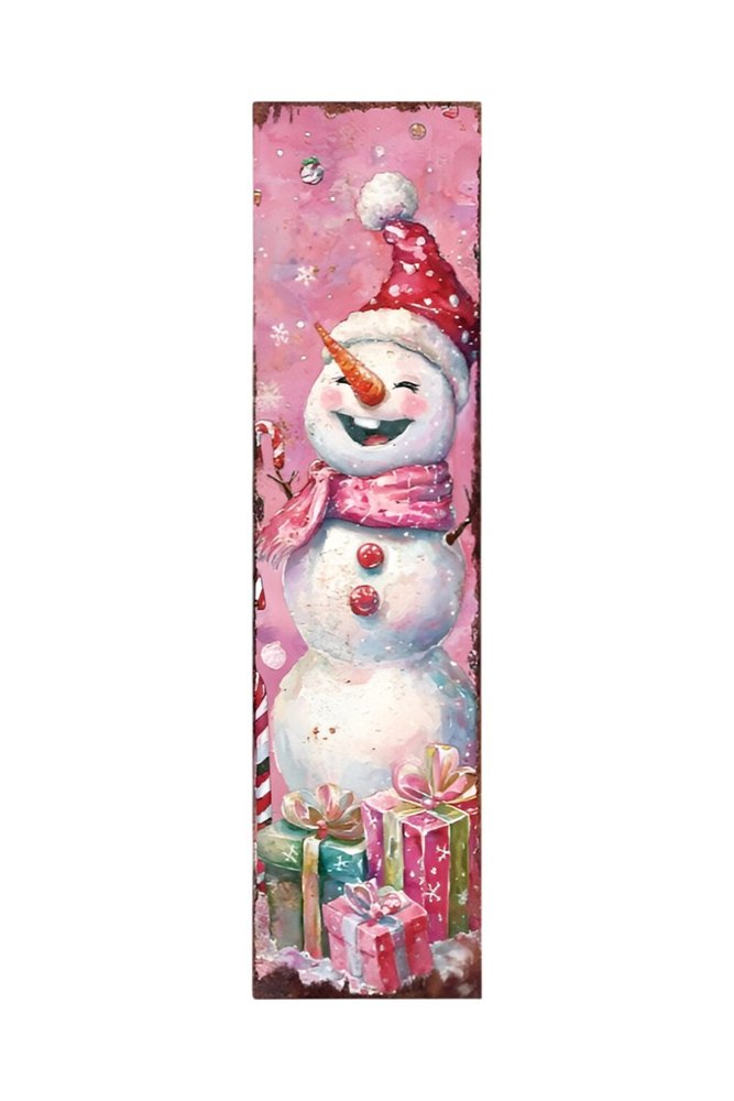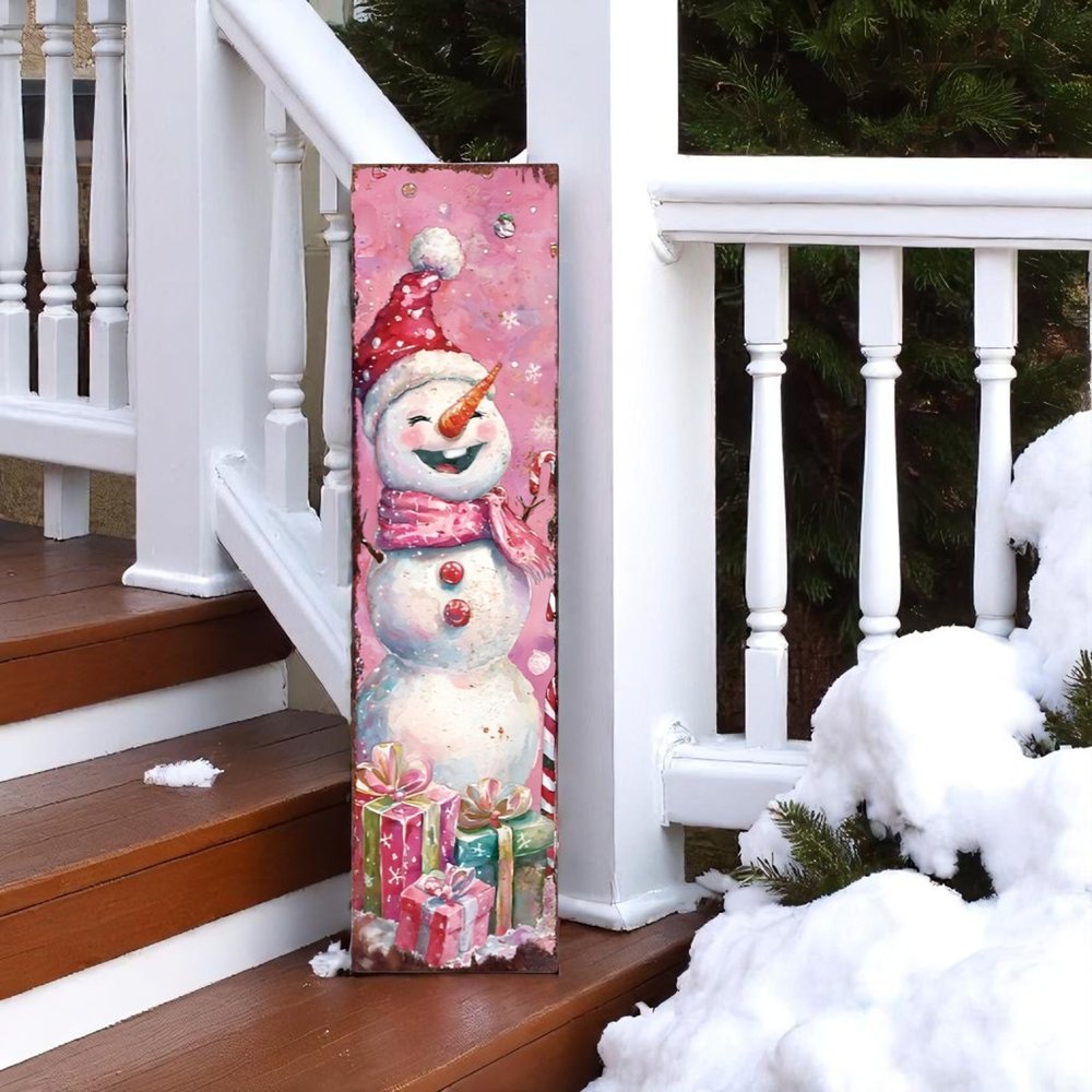 The 36-inch pink red and white christmas santa and snowman solid wood reversible porch sign adds a charming touch to your outdoor space. Crafted from solid wood, this traditional porch sign is designed to withstand the elements while bringing festive cheer to your home. Featuring a delightful santa on one side and a cheerful snowman on the other, it perfectly captures the spirit of christmas. The vibrant pink, red, and white colors create a warm and inviting atmosphere, making it an ideal accessory for your holiday decor. This reversible design allows for versatility, ensuring your porch remains stylish throughout the season. Enhance your outdoor decor with this delightful piece that celebrates the joyous moments of the holidays. 36-inch h x 10-inch w x 1-inch d.