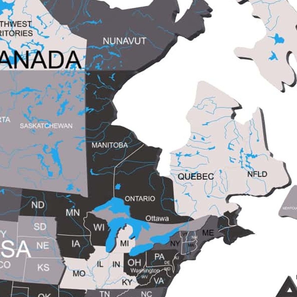47" X 79" Black Gray and White Wood World Map Hanging Dimensional Sculpture