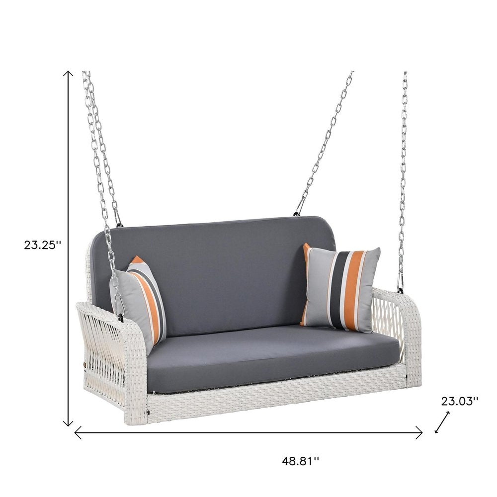 Experience the joy of gentle swinging and ultimate relaxation with the 49-inch white woven rattan outdoor hanging swing chair with gray cushions, adding a touch of whimsy and comfort to your outdoor space. Safe to use both indoors and out, this chair features a UV protective finish and is designed to be not only durable but comfortable. The included detachable cushions allow for better air circulation, preventing moisture buildup and enhancing the overall longevity of your seating. Enjoy the good life everyday with this fashionable hanging two person seating option. 23.25-inch h x 48.81-inch w x 23.03-inch d.