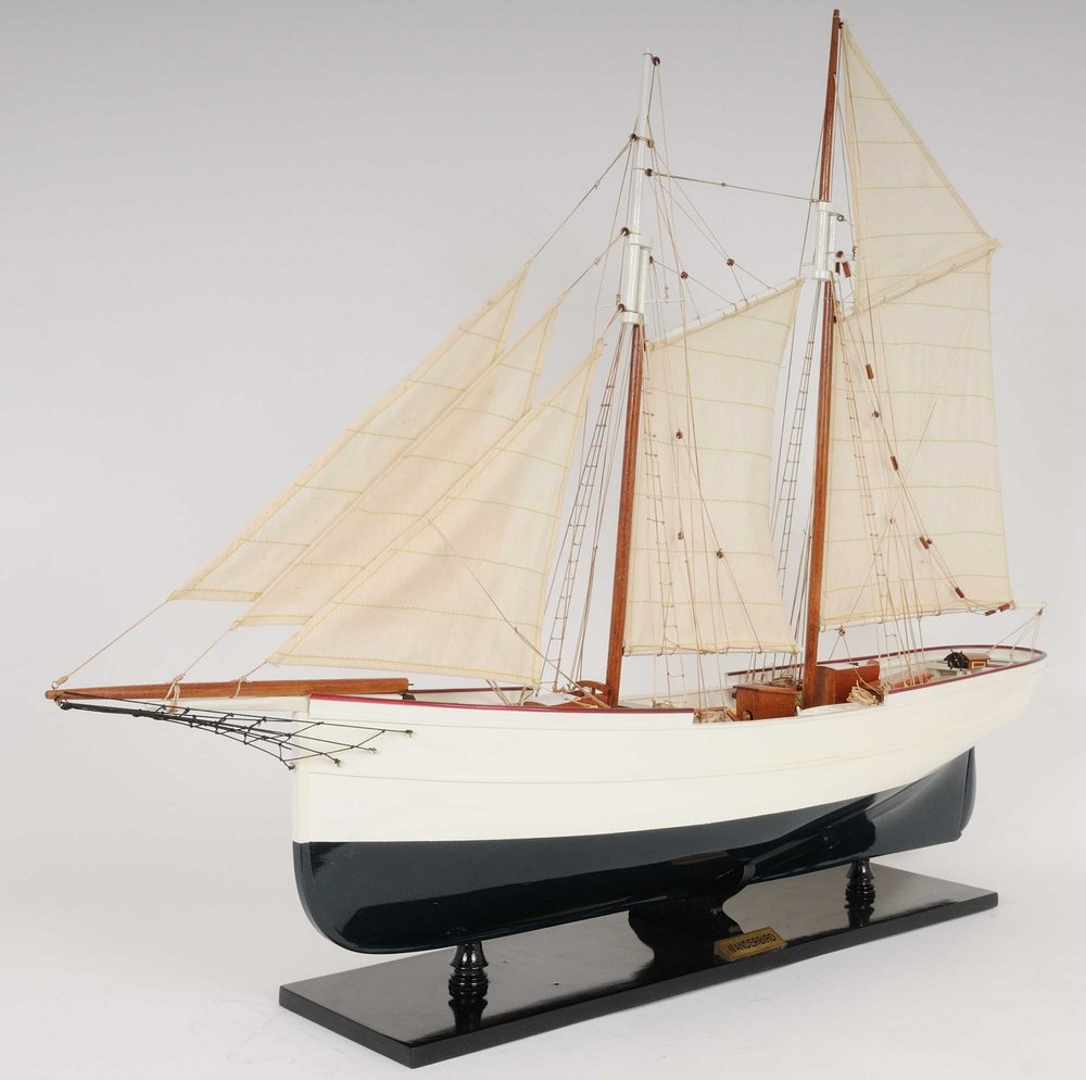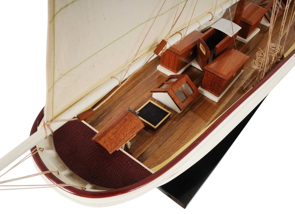This is Museum-quality, Fully Assembled edition of the Wanderbird. The model is 100% hand built from scratch using plank on frame construction method. Our master craftsmen have spent more than 100 hours to finish it. Made of Mahogany and painted in white and very dark blue(closer to black). This replicas magnificent details include metal steering wheel, skylight, deck houses, advanced intricate rigging, full cloth sails with detail stitching, wood inlay deck and many more. Comes on a solid wood base, with metal nameplate.