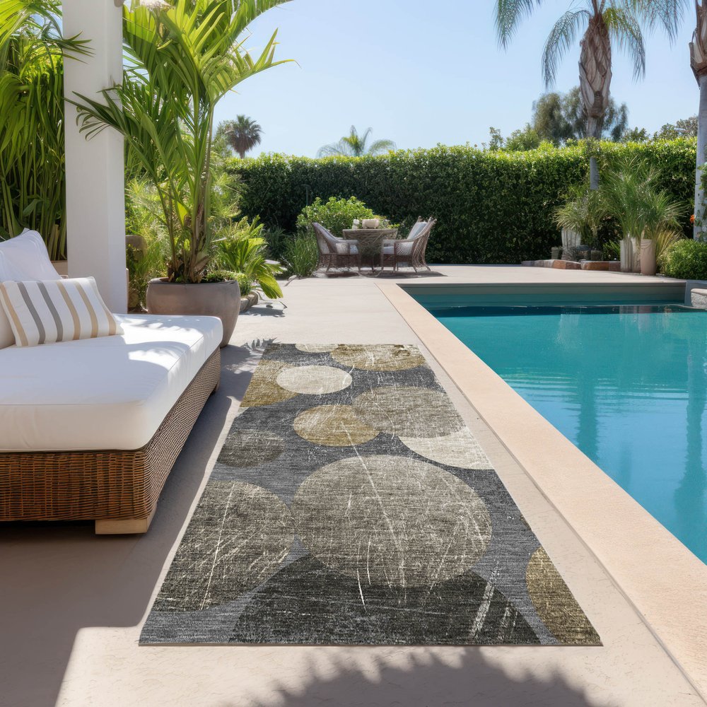 Set an inviting tone in your space with this 8-foot gray and blue abstract washable indoor outdoor runner rug. This runner shaped rug features a abstract design that will work well both indoors or out. A classic shape marries with good looking design for your living room, hall, bedroom, porch, patio, or poolside. Ideal for outdoor spaces or high traffic areas with kids and pets, this rug is made from heavy duty polyester that is stain resistant to help repel water, dirt, and stains. Versatile in use, durable, and easy to maintain, this rug is an ideal solution to add a decorative and inviting touch to your indoor or outdoor space. 27-inch h x 90-inch w x 0.19-inch d.