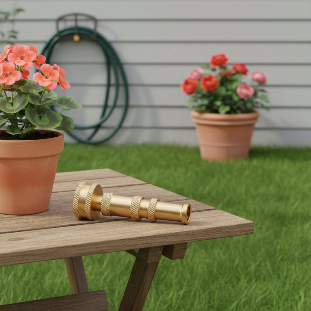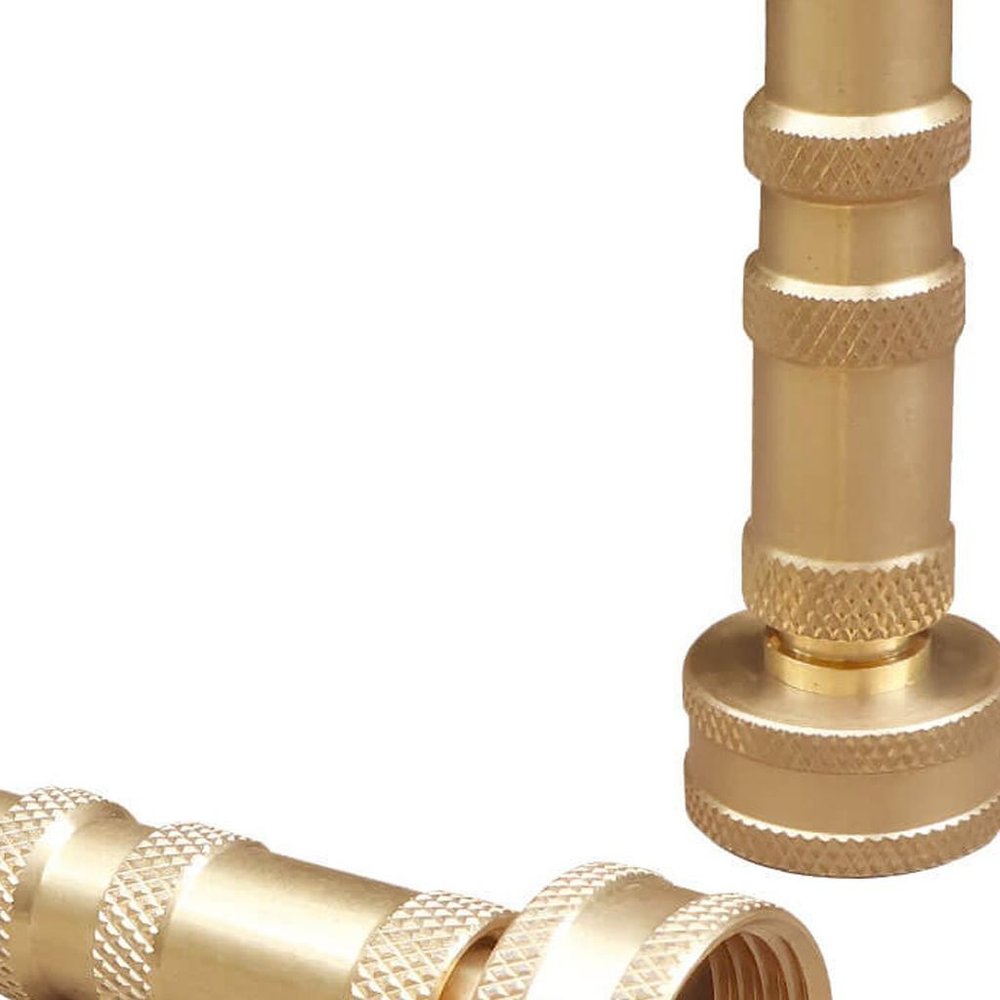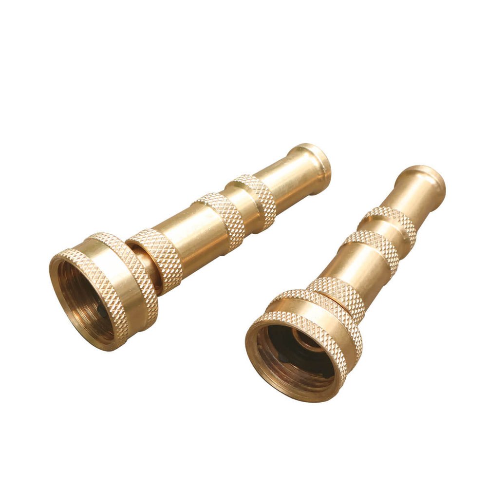 The set of two brass metal hose nozzle is a perfect blend of functionality and elegance for your outdoor space. Crafted from durable metal, these nozzles offer a sturdy option for all your watering needs. The classic brass color adds a touch of sophistication to your garden decor. Designed with ease of use in mind, they facilitate efficient watering while enhancing the aesthetic appeal of your garden. This set is an ideal accessory for anyone looking to elevate their outdoor experience with stylish practicality. Perfect for both seasoned gardeners and casual plant lovers, these nozzles combine quality and design effortlessly, making them a must-have addition to your garden tools. 4.00-inch h x 2.00-inch w x 1.00-inch d.