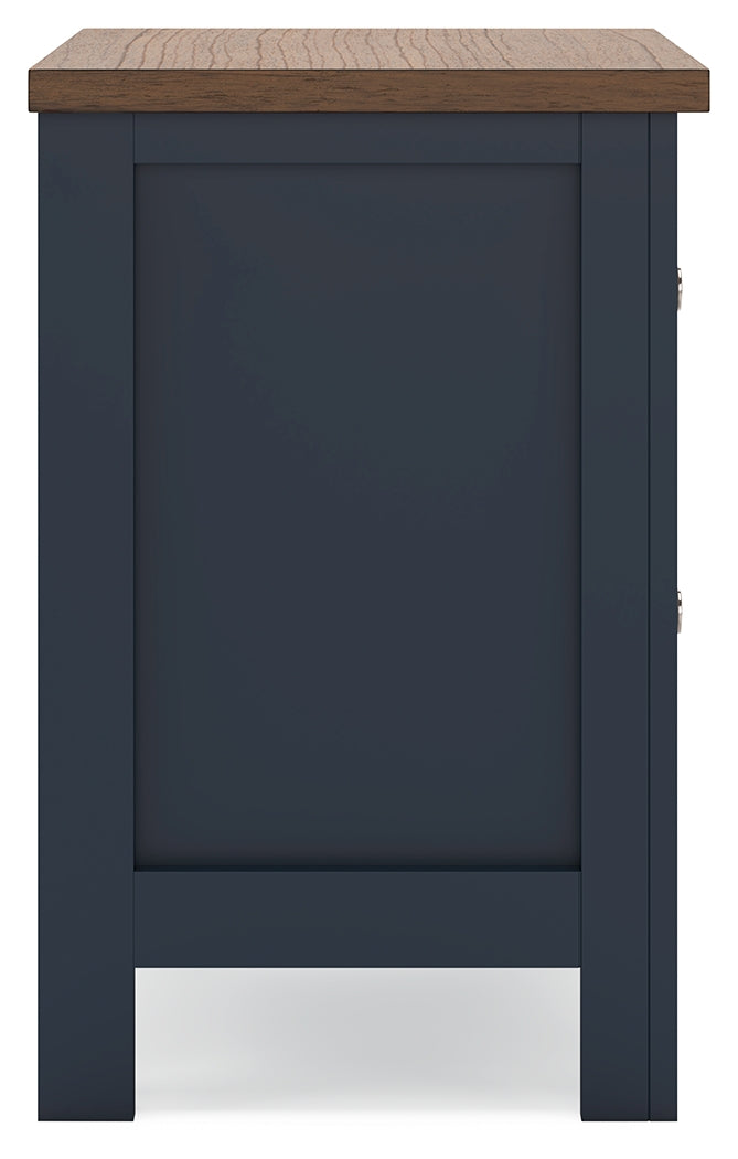 Two-tone finish features a dark slate blue with a light brown wood-tone top