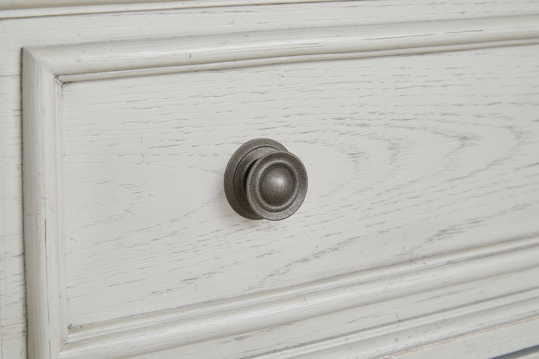 Elegant, timeless furnishings take your bedroom to the next level. Nothing does that better than this king panel storage bed. The antiqued white finish with a wonderful grain texture radiates sophistication, while the dark bronze-tone hardware adds an ornate touch to the handy storage drawers.