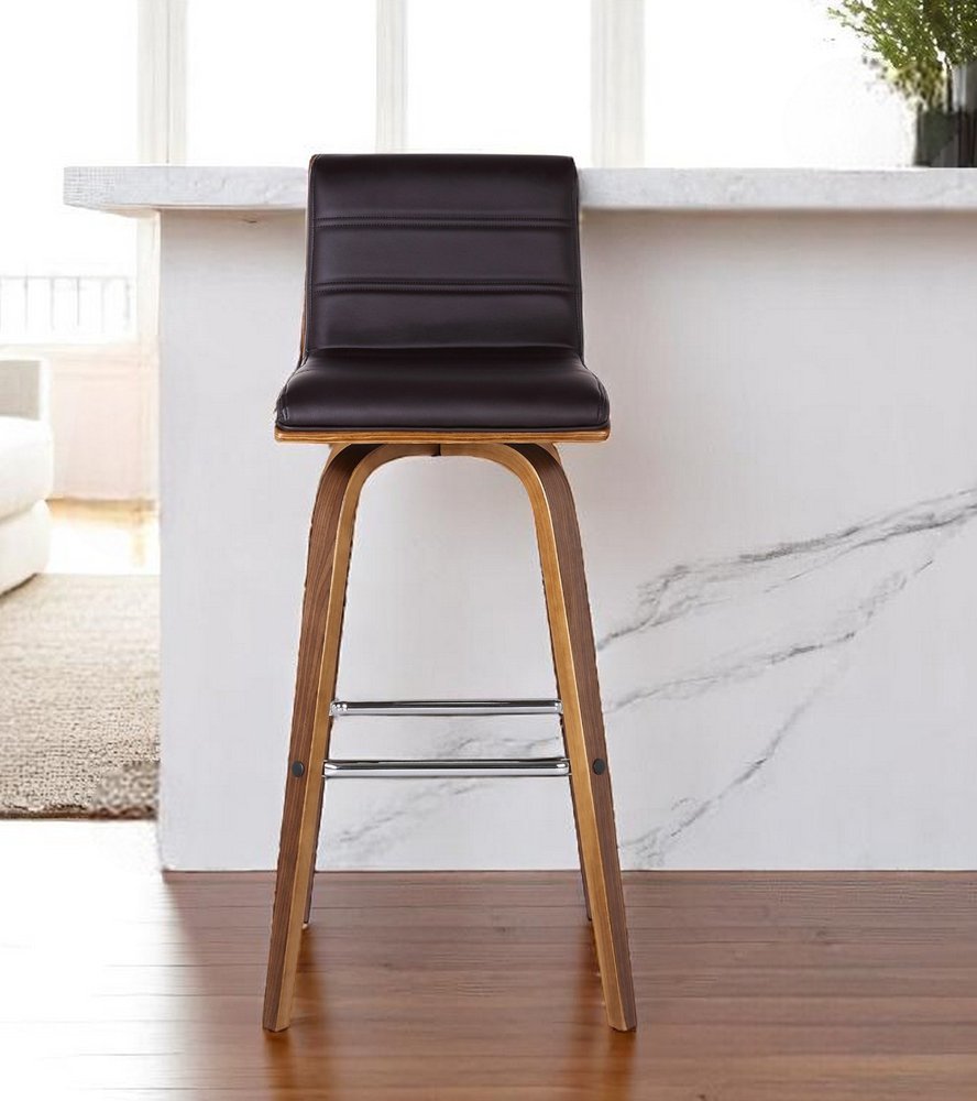 This 39" brown solid wood swivel low back bar height chair with footrest will be the perfect way to add some cool design and utility to your space similar to what you find in your favorite cafes or pubs. The base of this stool is made from solid wood in a brown, that matches the brown durable faux leather. The low back gives this chair a comfortable and fashionable look. Designed with a footrest for comfort and convenience. 39" H x 17" W x 20" D
