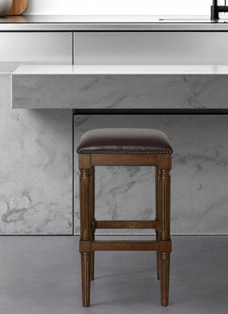 The perfect way to add some extra seating in your home, this 31-inch brown and dark brown solid wood backless bar height bar chair will elevate the look and vibe of your room. The dark brown coloration of the high quality solid wood base marries nicely with the brown upholstered seat. A backless mixed with a square shaped seat makes this chair both comfortable and fashionable. Designed with a footrest for comfort and convenience. 30.25-inch H x 16-inch W x 16-inch D