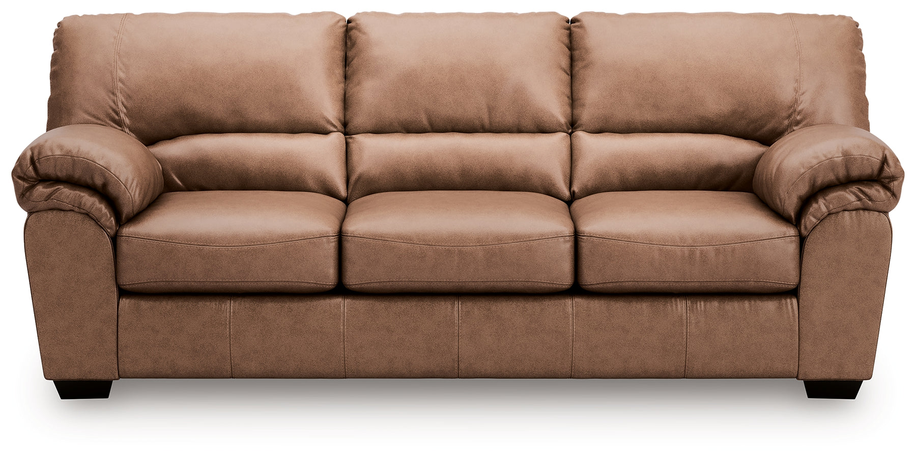 Modern comfort never looked so good. Sporting supremely soft yet durable cushions accented with high-fashion jumbo stitching, this stunning sofa is the ultimate choice in comfortably cool, contemporary style. Its umber-hued faux leather indulges with an upscale feel and wows like the real thing.