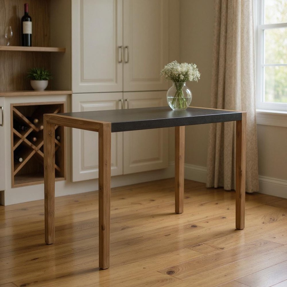 Whether you're hosting a backyard barbecue or just lounging in the sun, our 56-inch gray and natural faux concrete and solid wood outdoor bar table is the perfect addition to any space. This indoor / outdoor high top table provides a great space for everyday drinking, dining, or entertaining. This table features a classic quadratic shape and a faux concrete stone top that looks great. 37.40-inch h x 56.00-inch w x 32.00-inch d.