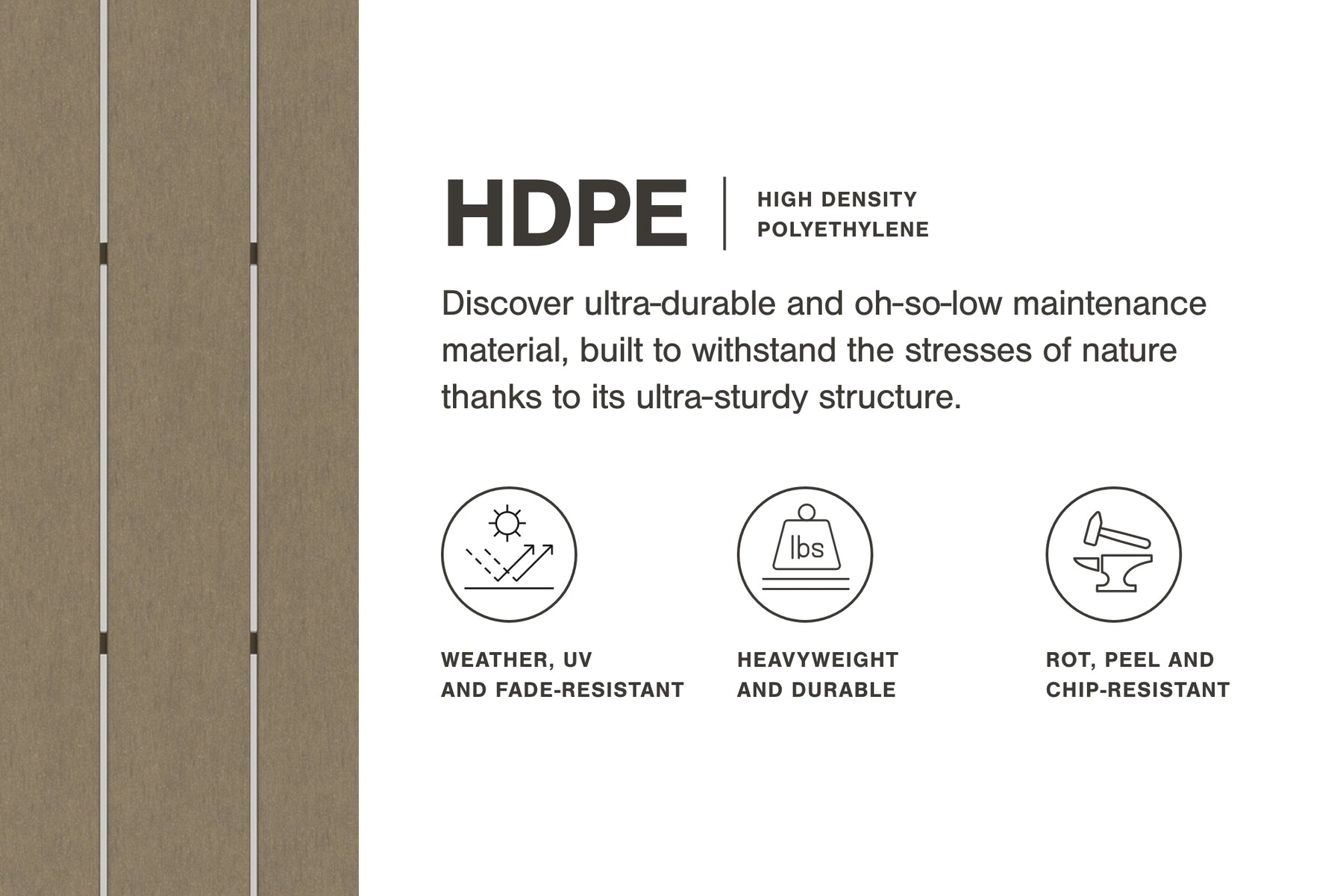Made of MEGA-TUFF® HDPE (a high-density polyethylene), which gives the wood look you love and the weather resistance you crave