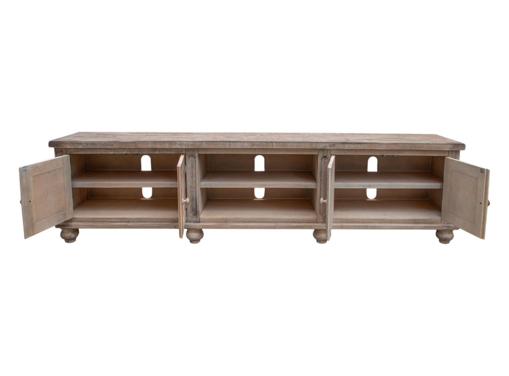 Ready to be enjoyed in your living room, family room, or recreation room, this 93" desert sand solid wood cabinet enclosed storage distressed tv stand is a practical and good looking piece of furniture that will help to anchor your room. Curated from a mix of high quality solid pine wood and durable manufactured wood, this console is beautiful, and built to last. Due to the genuine nature of the wood some natural wood knots, and grain and color variations may occur. N To add to the versatility, this piece features open non-concealed storage that can be used for not only storage but display as well. A cord cut out hole is ideal for wire and cable managment to keep your space looking tidy. Ideal for tv placement and storage in your living room, bedroom or office. 27" H x 93" W x 15.75" D