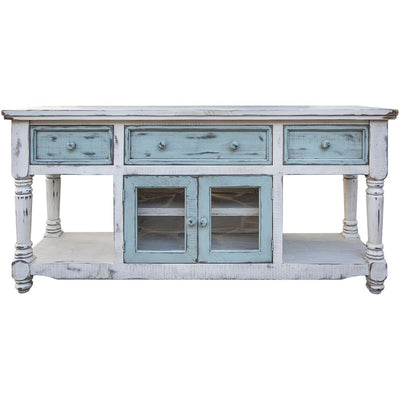 70" Blue and White Solid Wood Open shelving Distressed TV Stand