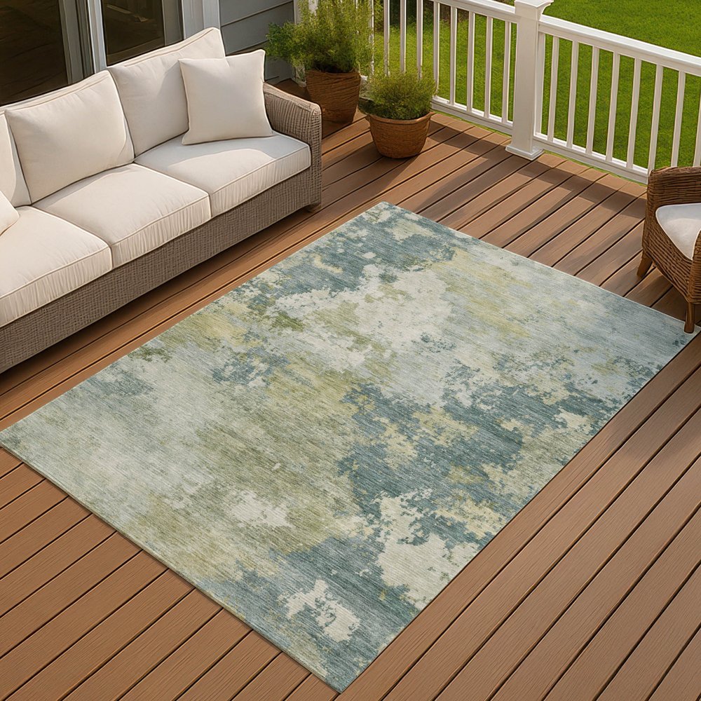 This 10-foot x 14-foot aqua and green abstract washable indoor outdoor area rug, is a great way to add warmth to a room. This rectangle shaped rug features a abstract design that will work well both indoors or out. A classic shape marries with good looking design for your living room, hall, bedroom, porch, patio, or poolside. Ideal for outdoor spaces or high traffic areas with kids and pets, this rug is made from heavy duty polyester that is stain resistant to help repel water, dirt, and stains. Versatile in use, durable, and easy to maintain, this rug is an ideal solution to add a decorative and inviting touch to your indoor or outdoor space. 120.00-inch h x 168.00-inch w x 0.19-inch d.