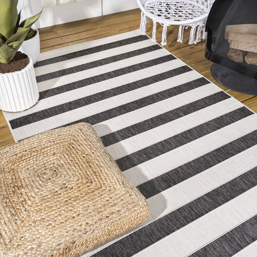 Add great coloration and comfortable texture to your space with this 10-foot x 14-foot black and cream striped indoor outdoor area rug. This rectangle shaped rug features a striped design that will work well both indoors or out. A classic shape marries with good looking design for your living room, hall, bedroom, porch, patio, or poolside. Makes a great way to dress up your patio, porch, or poolside, but also works well as a durable and easy to maintain option in the kitchen, family room, or mudroom. 120.00-inch h x 168.00-inch w x 0.19-inch d.