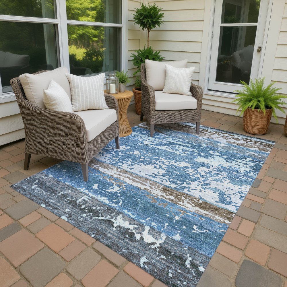Add some artistry to your room with this 10-foot x 14-foot blue ivory and brown striped washable indoor outdoor area rug. This rectangle shaped rug features a striped design that will work well both indoors or out. A classic shape marries with good looking design for your living room, hall, bedroom, porch, patio, or poolside. Ideal for outdoor spaces or high traffic areas with kids and pets, this rug is made from heavy duty polyester that is stain resistant to help repel water, dirt, and stains. Versatile in use, durable, and easy to maintain, this rug is an ideal solution to add a decorative and inviting touch to your indoor or outdoor space. 120.00-inch h x 168.00-inch w x 0.19-inch d.