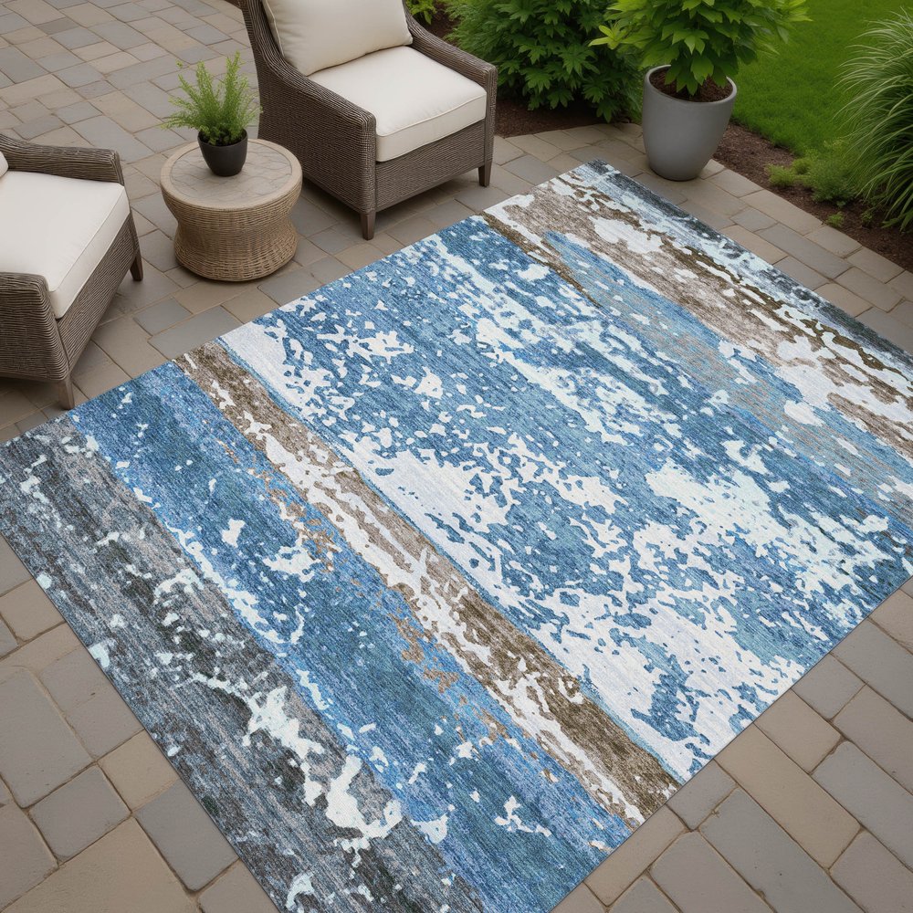 10' X 14' Blue Ivory And Brown Striped Washable Indoor Outdoor Area Rug