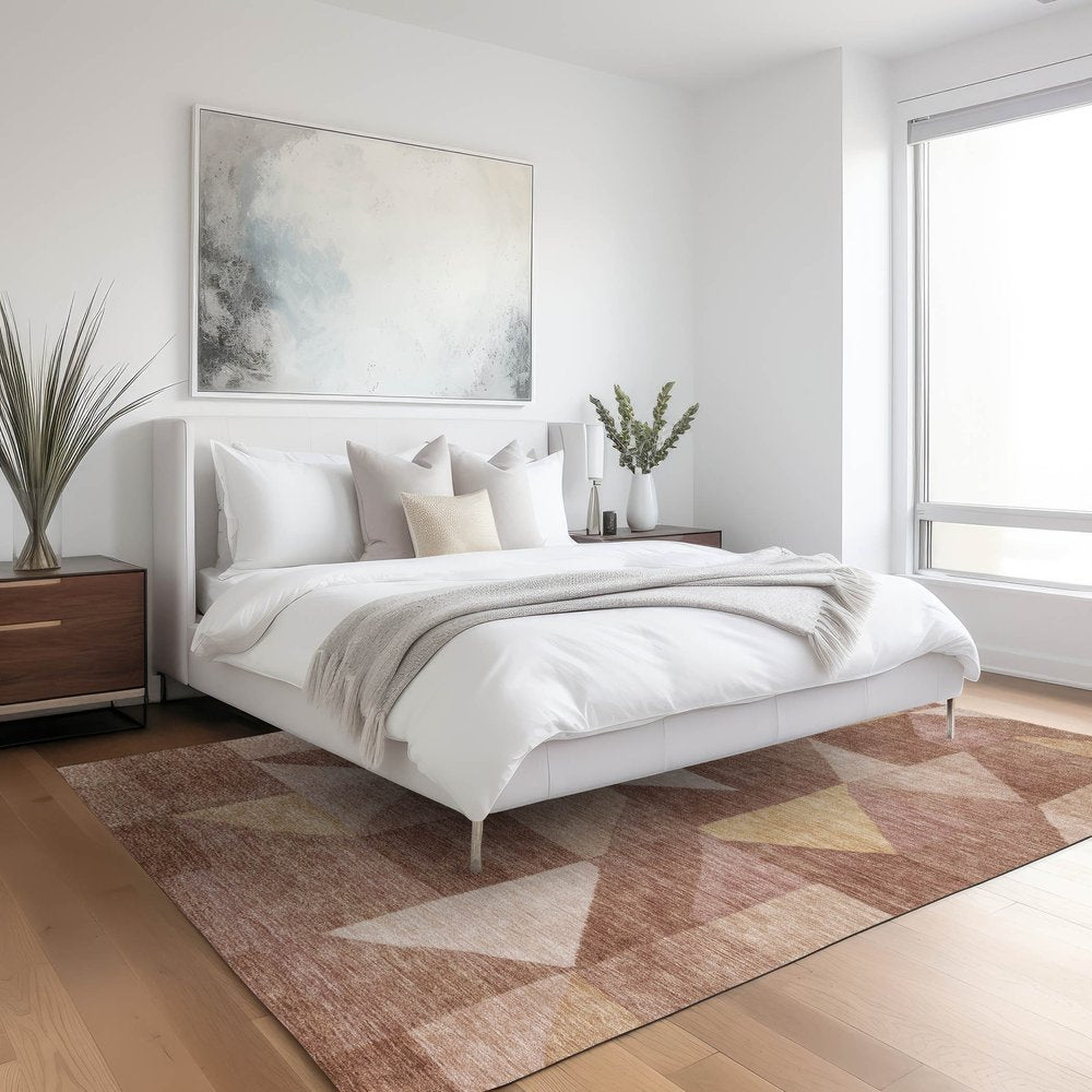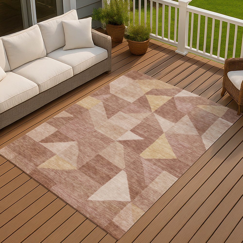 Add some artistry to your room with this 10-foot x 14-foot blush and wheat geometric washable indoor outdoor area rug. This rectangle shaped rug features a geometric design that will work well both indoors or out. A classic shape marries with good looking design for your living room, hall, bedroom, porch, patio, or poolside. Ideal for outdoor spaces or high traffic areas with kids and pets, this rug is made from heavy duty polyester that is stain resistant to help repel water, dirt, and stains. Makes a great way to dress up your patio, porch, or poolside, but also works well as a durable and easy to maintain option in the kitchen, family room, or mudroom. 120.00-inch h x 168.00-inch w x 0.19-inch d.
